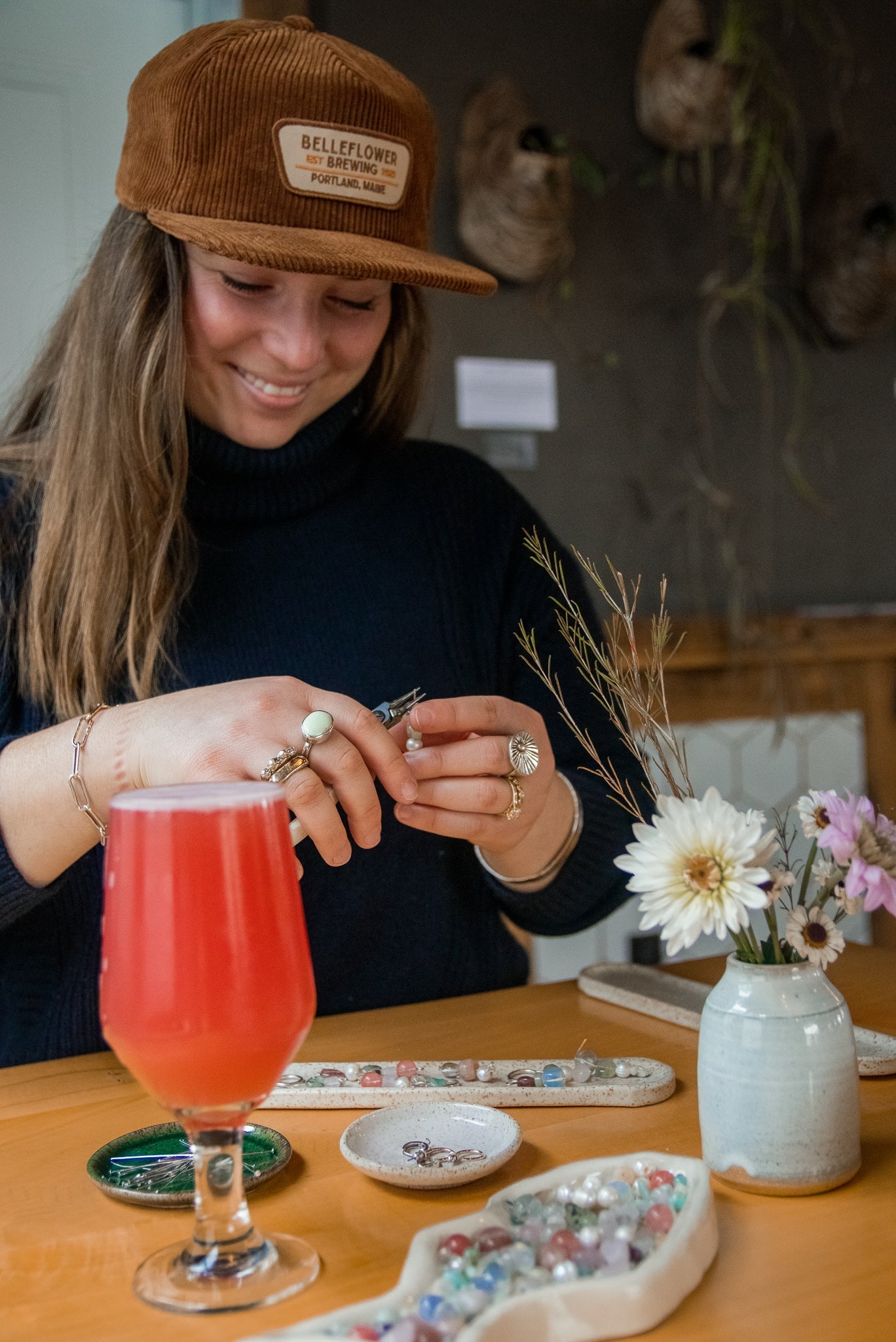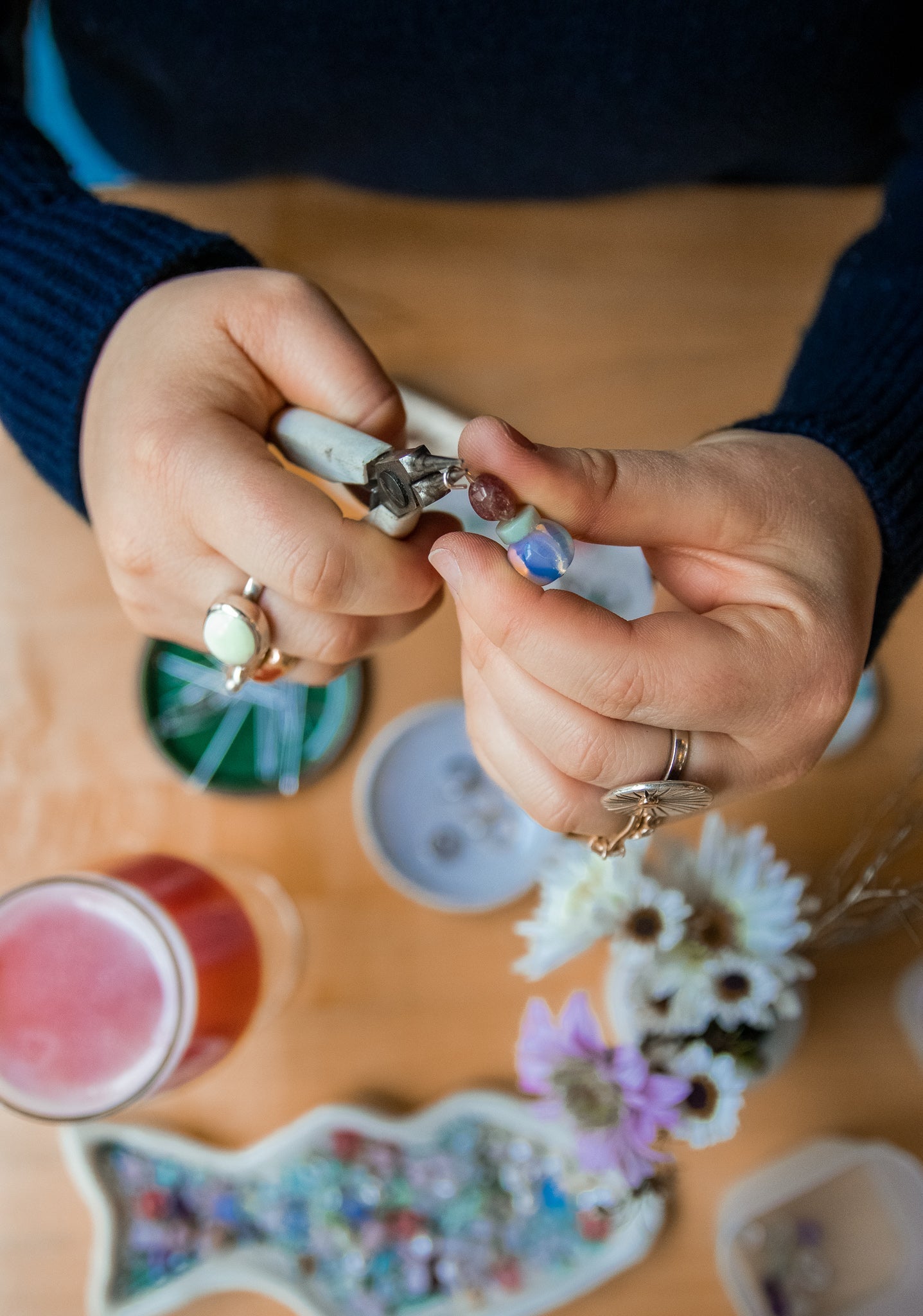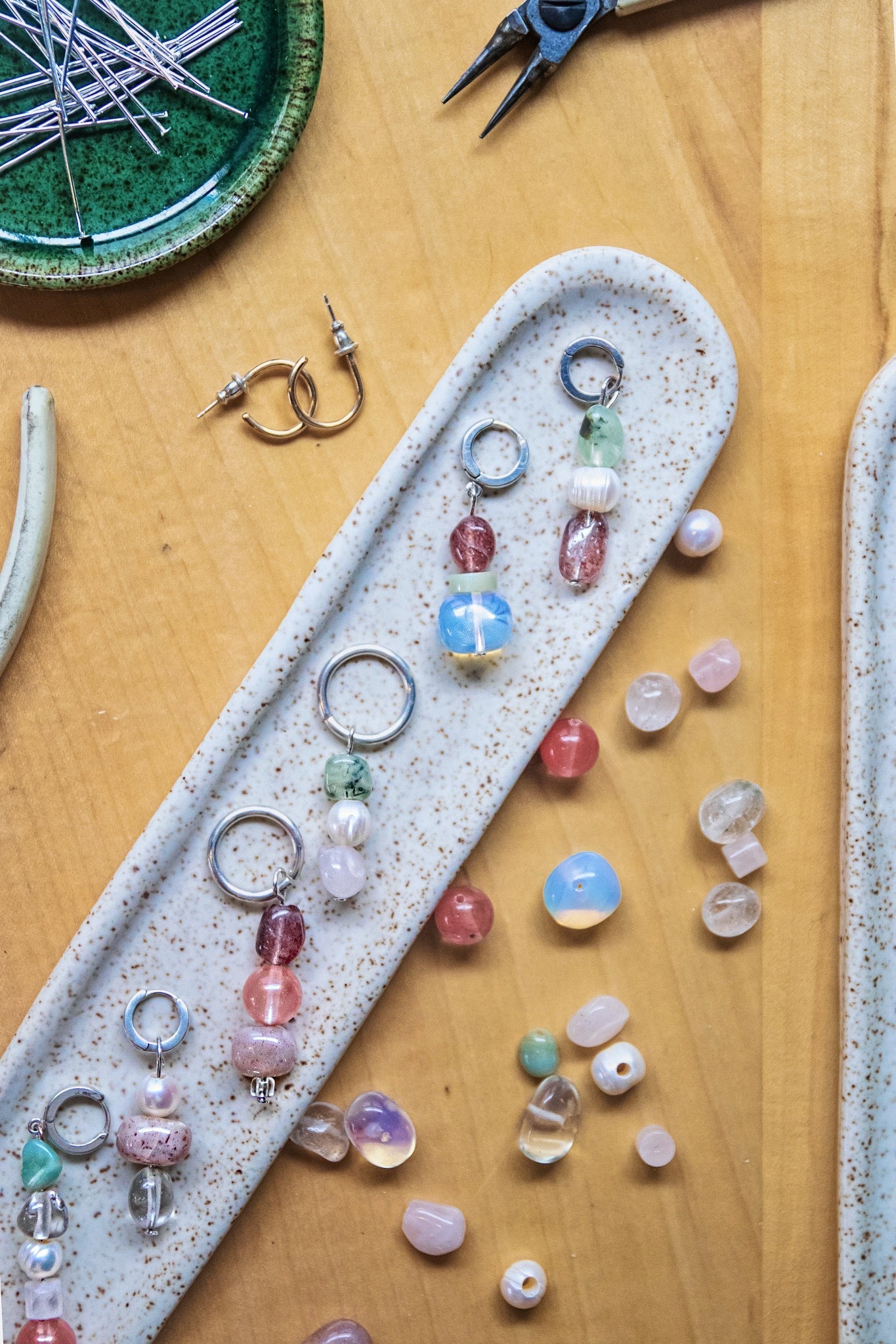 At the end of this class you will walk away with one pair of earrings, strung, and formed onto either sterling silver hoops or 14k yellow gold filled hoops. Keep in mind we will be using only sterling silver head pins (what the beads get strung on). Ready to be given as gifts or for you to wear right then.