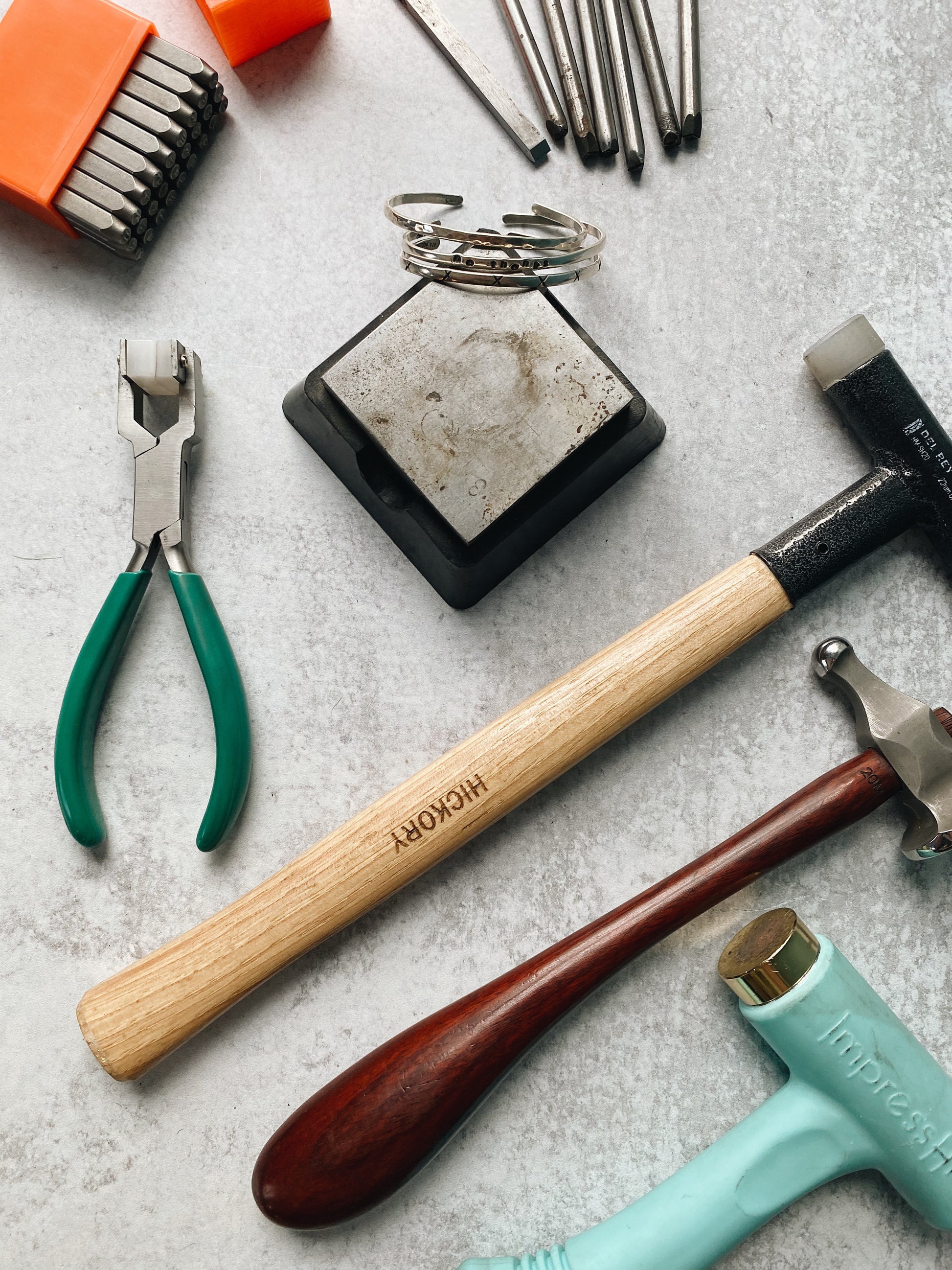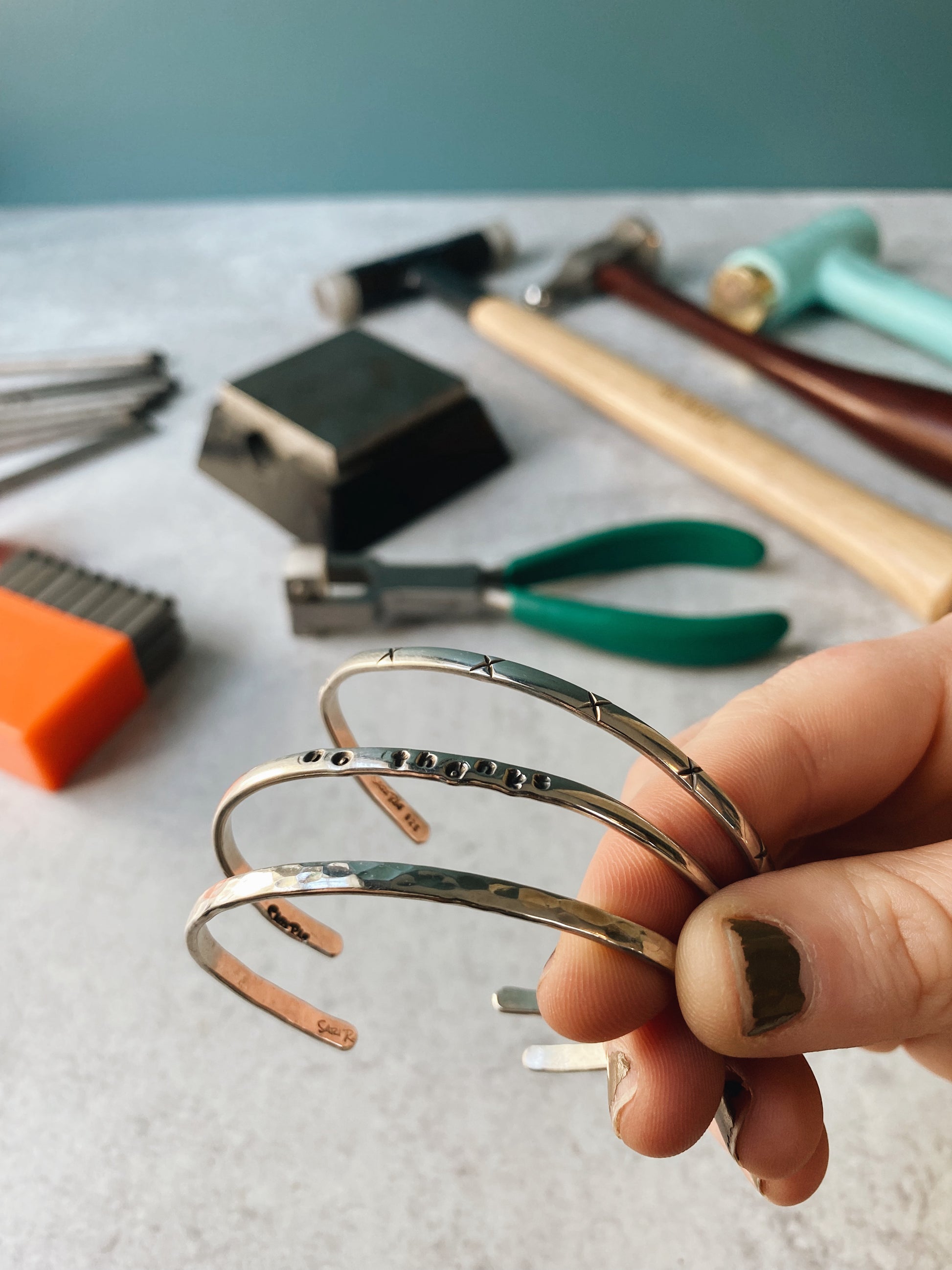 There will many options for you to choose how you design your cuffs. There will be letter and number metal stamps. Ball peen and planishing hammers for texture. Symbol and different shape metal stamps. Or you can even just keep one plain!