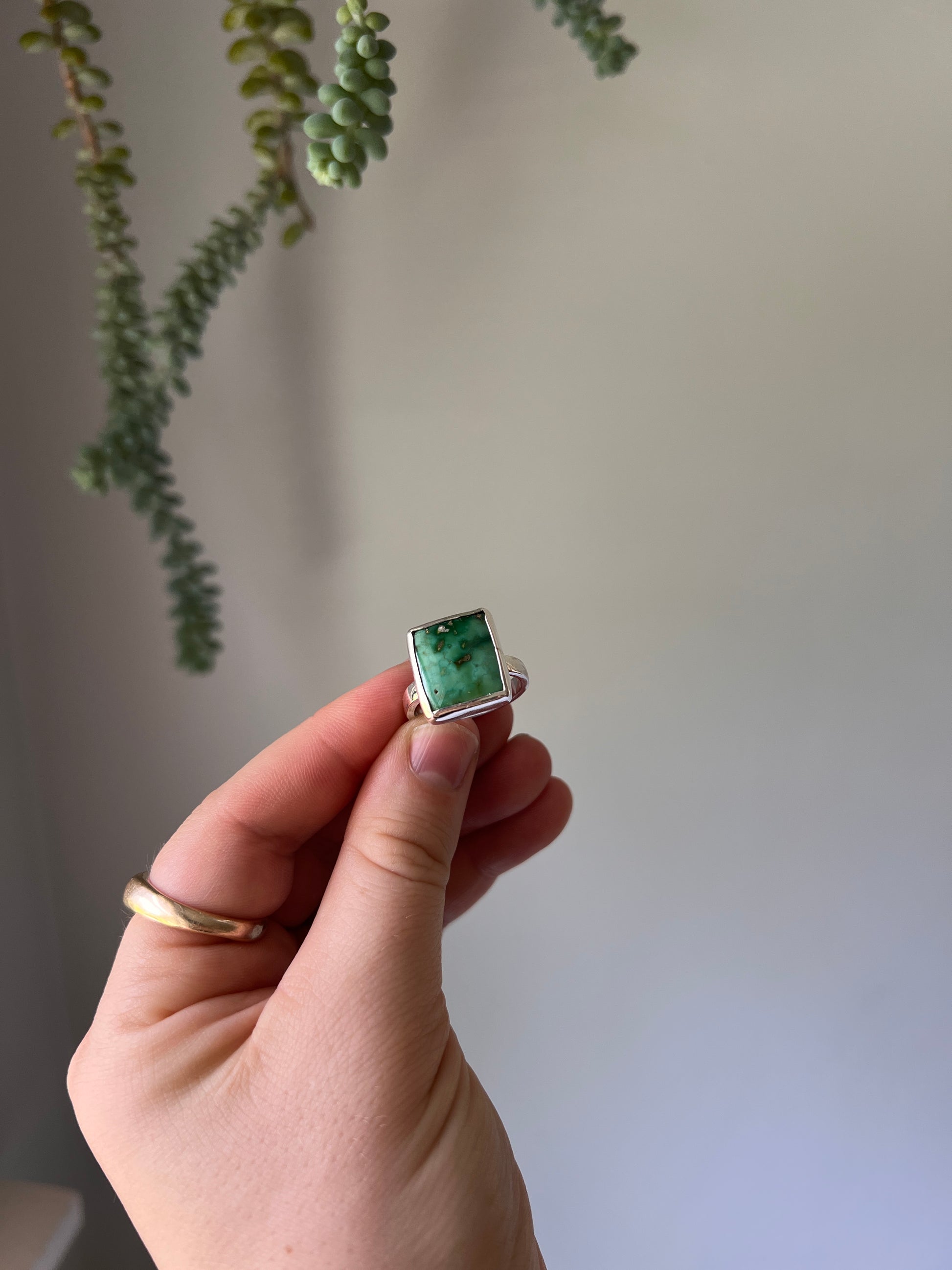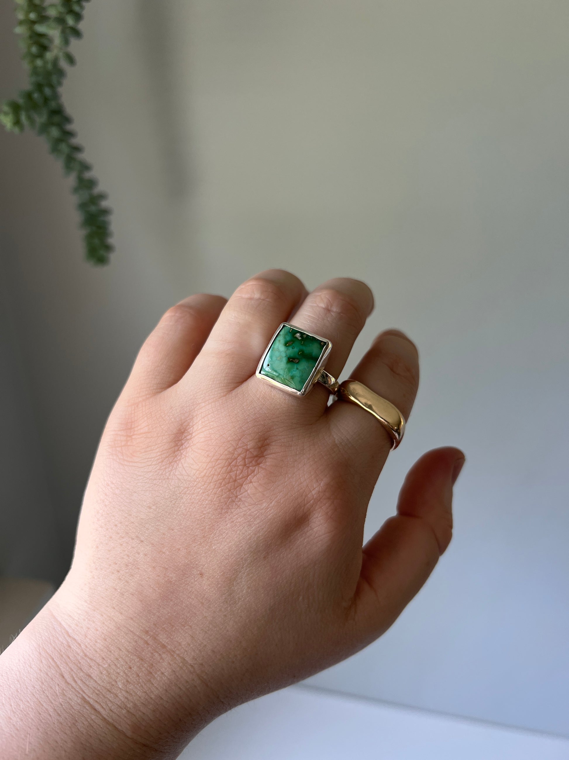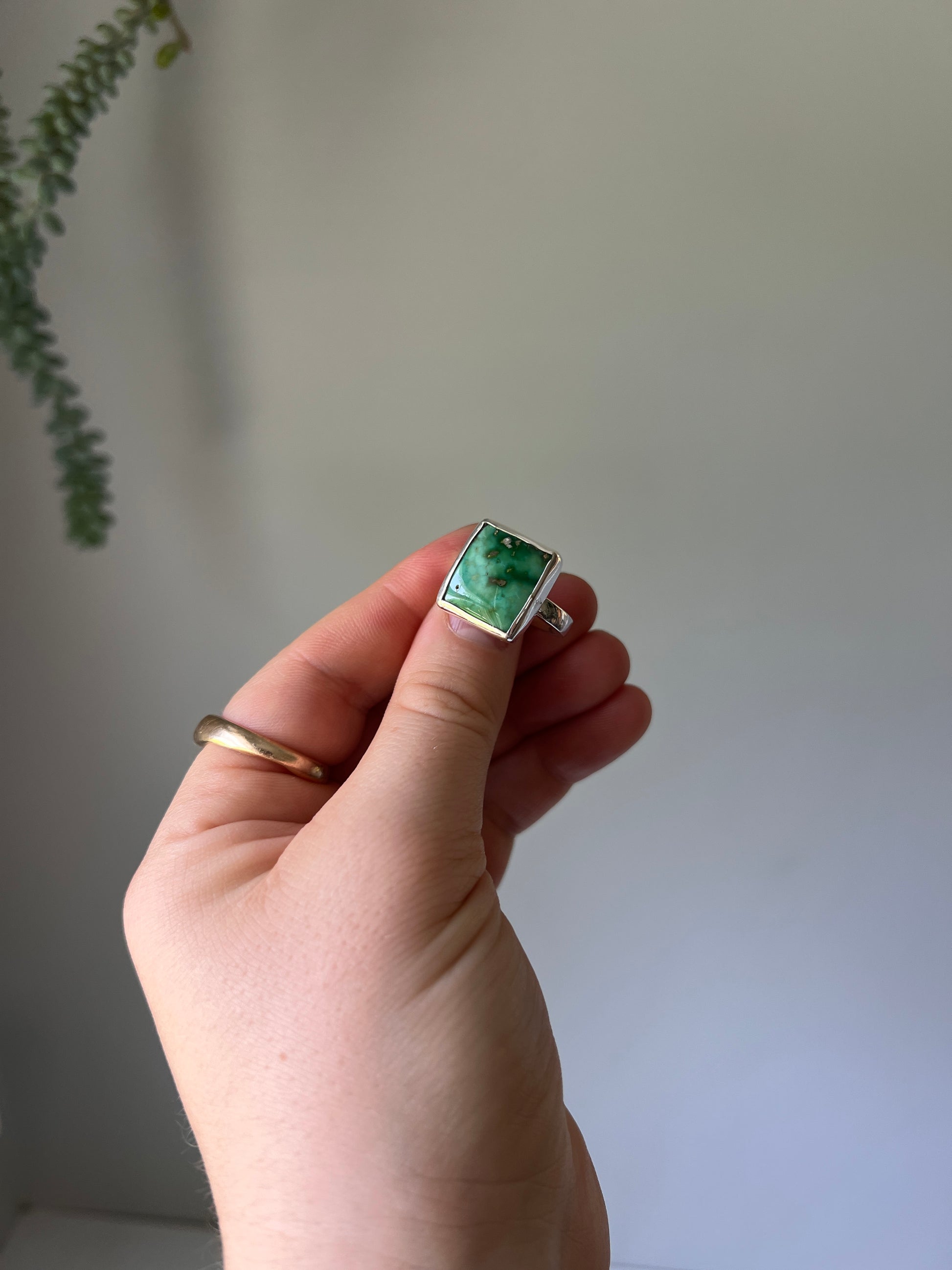 Emerald valley stone. Set in sterling silver. Size 8. Smooth comfort fit band. Can be sized up slightly.