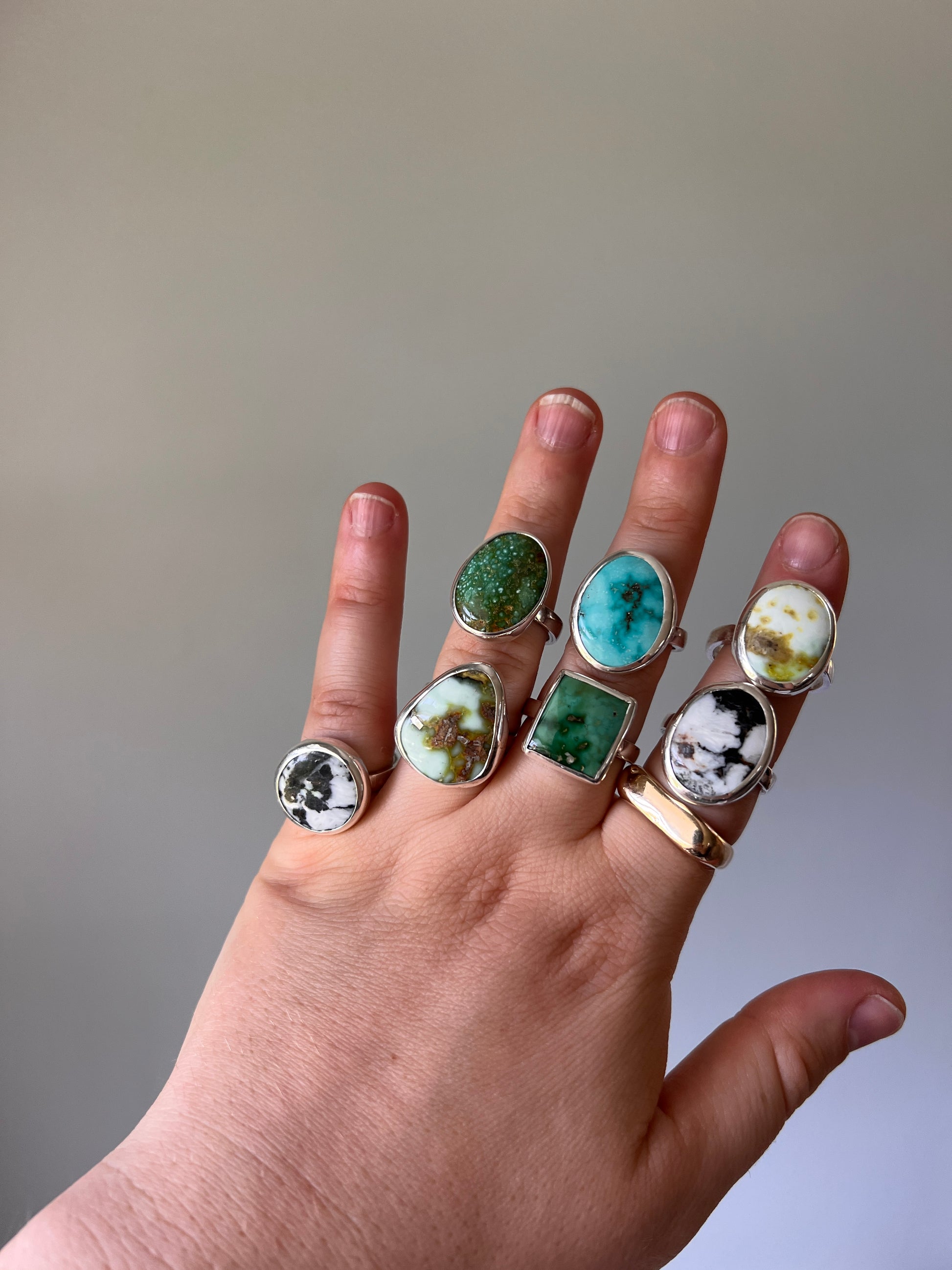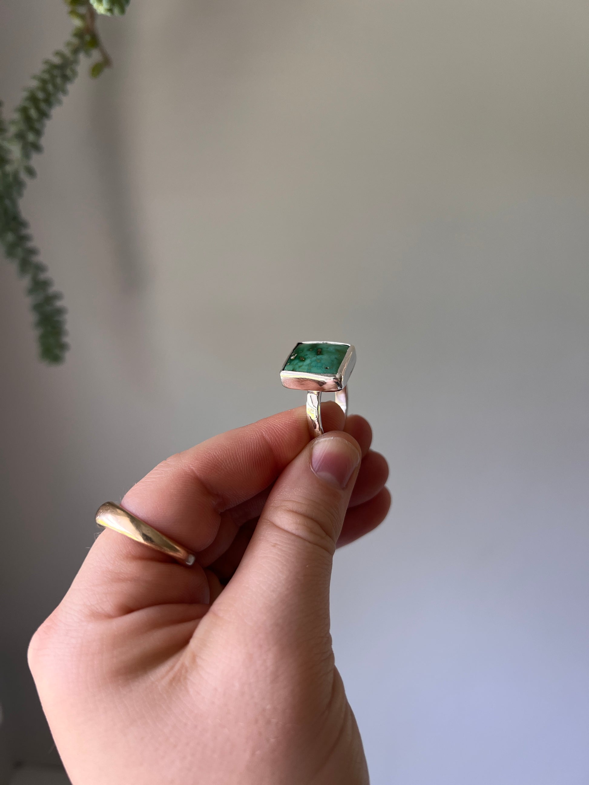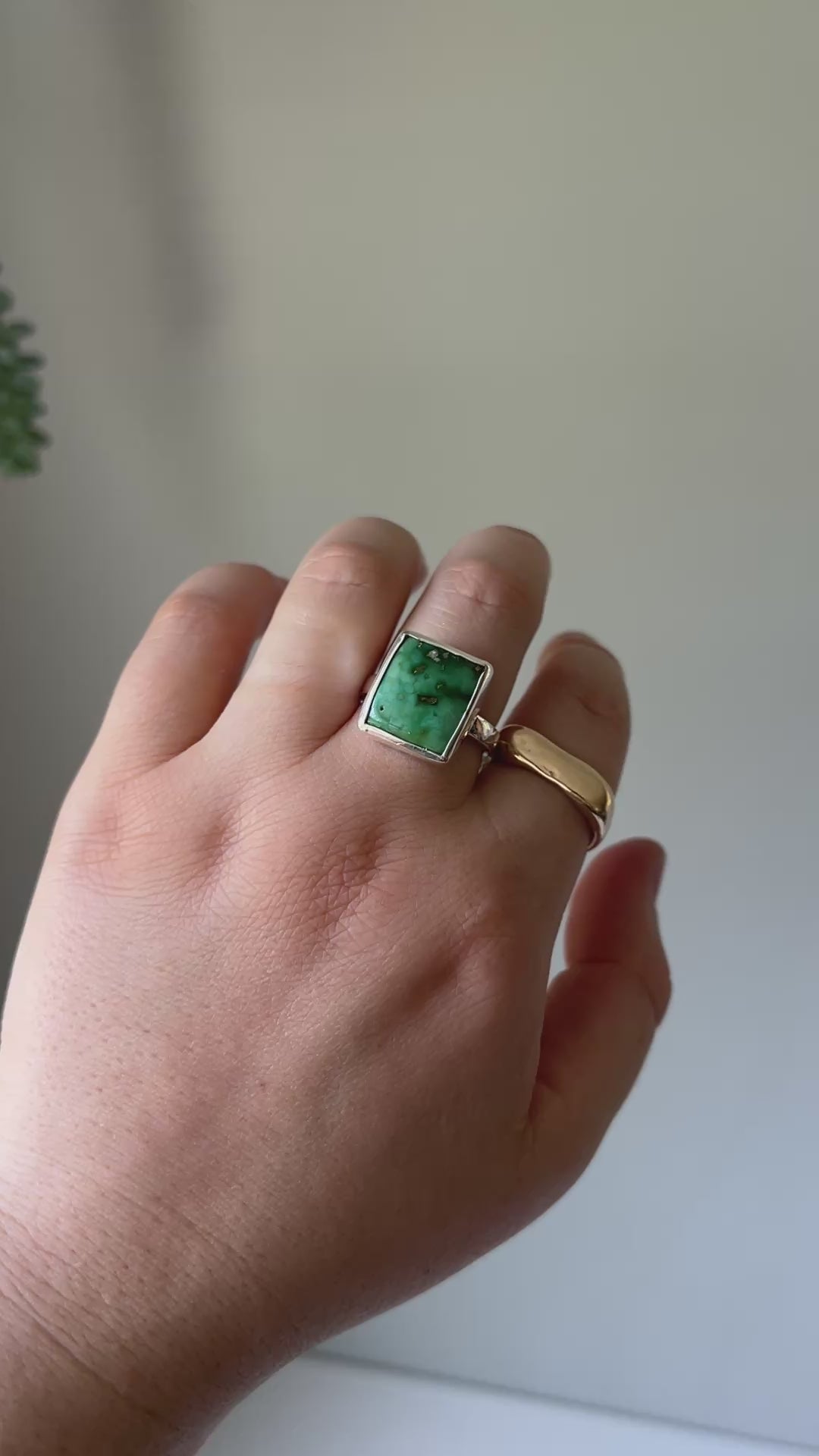 Emerald valley stone. Set in sterling silver. Size 8. Smooth comfort fit band. Can be sized up slightly.