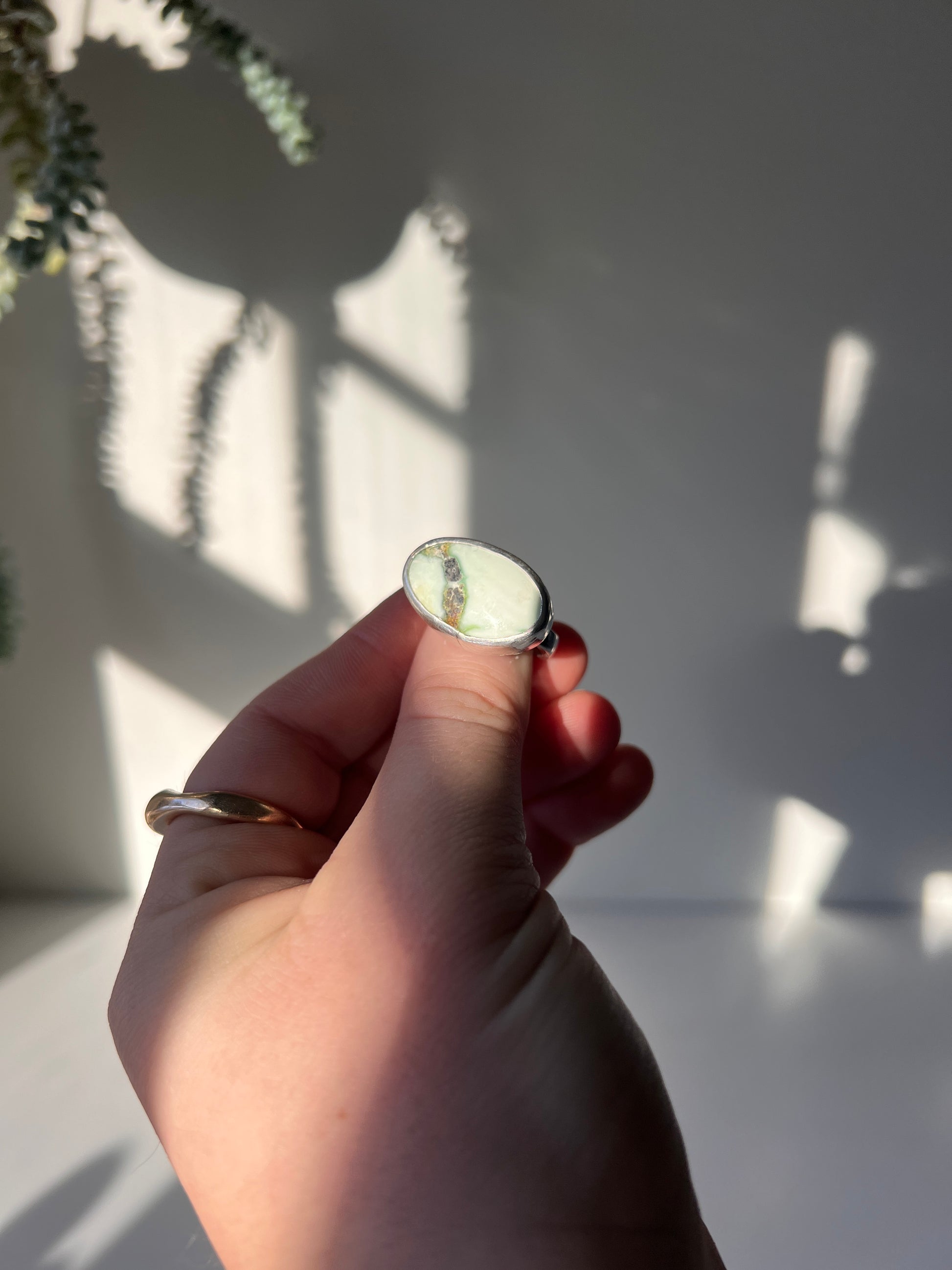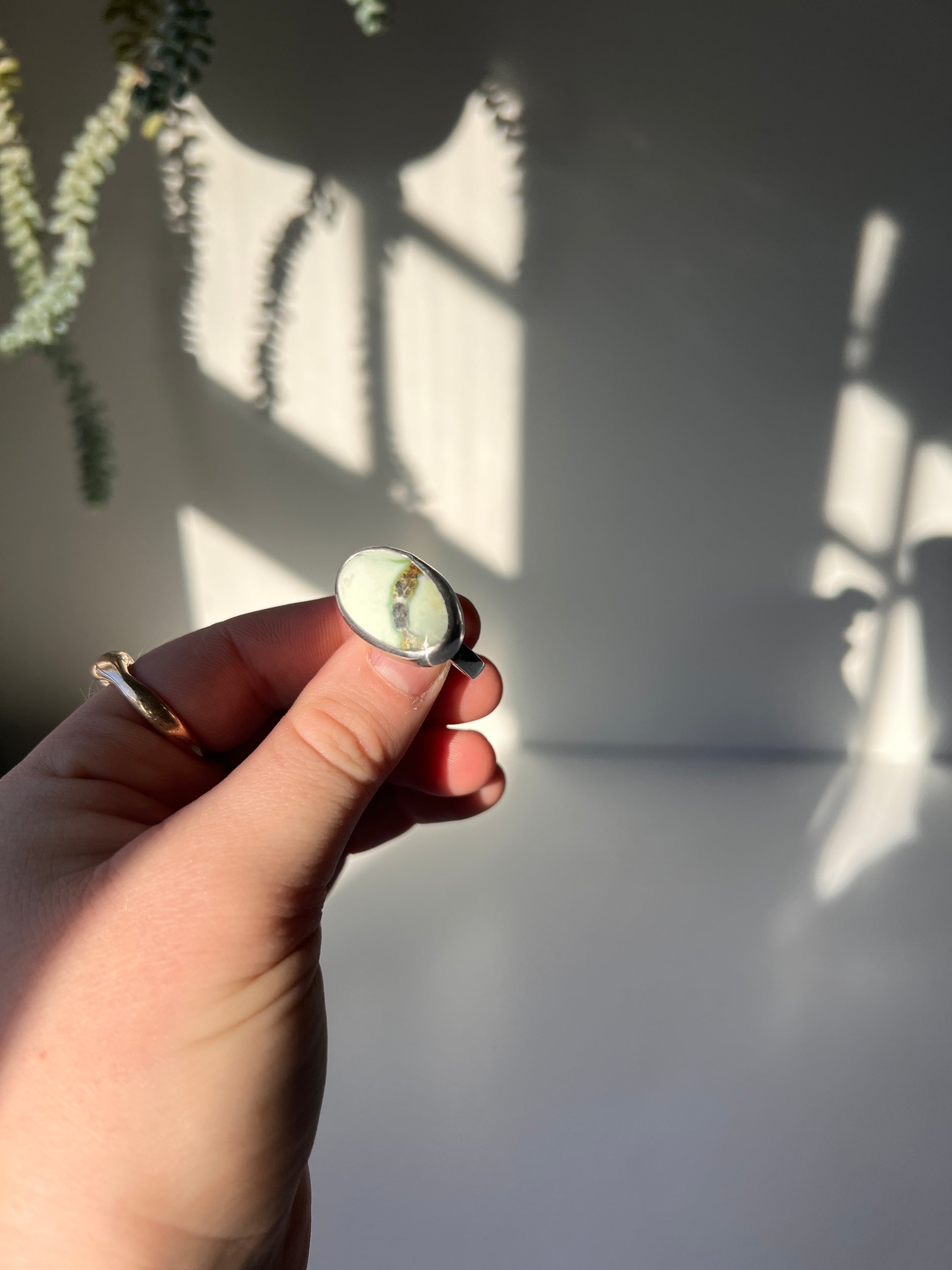 Palomino stone. Set in sterling silver. Size 7. Smooth comfort fit band. Can be sized up slightly.