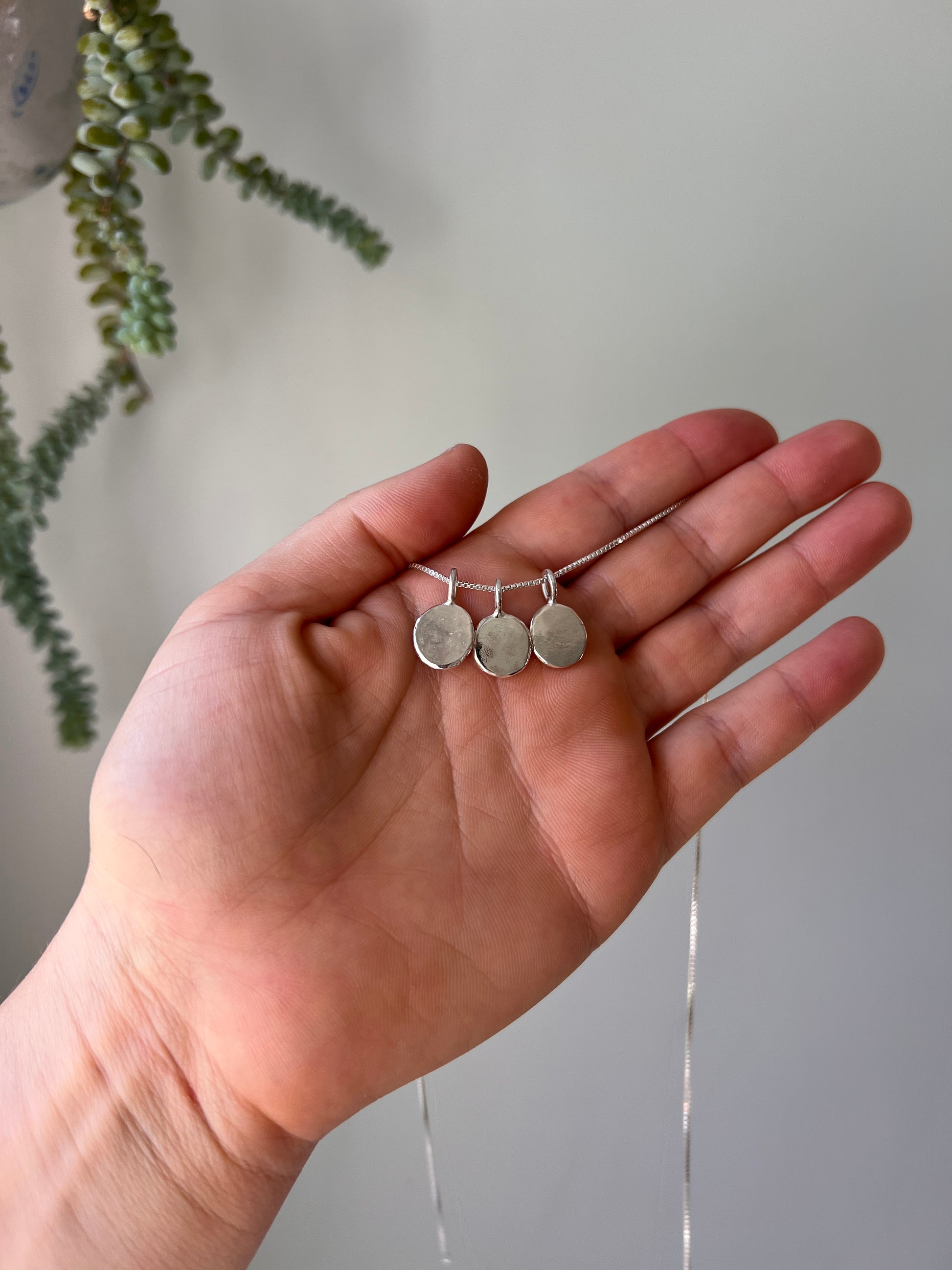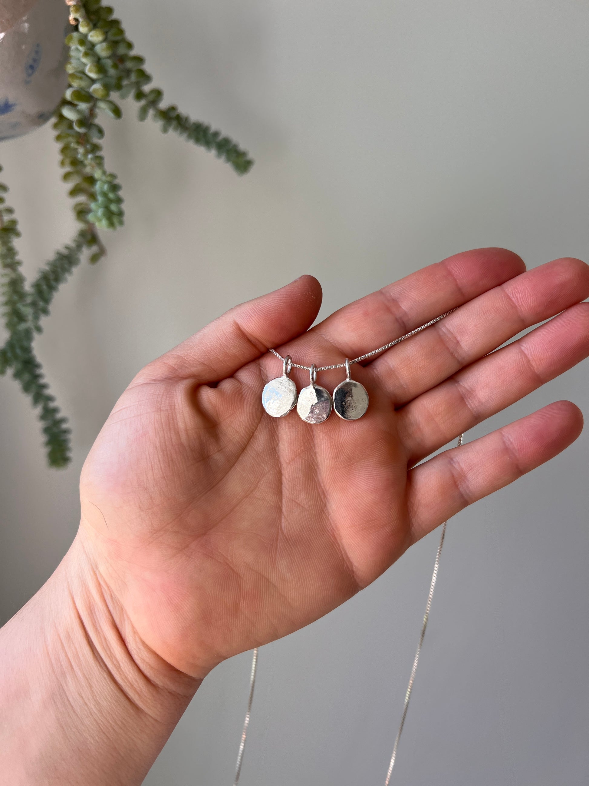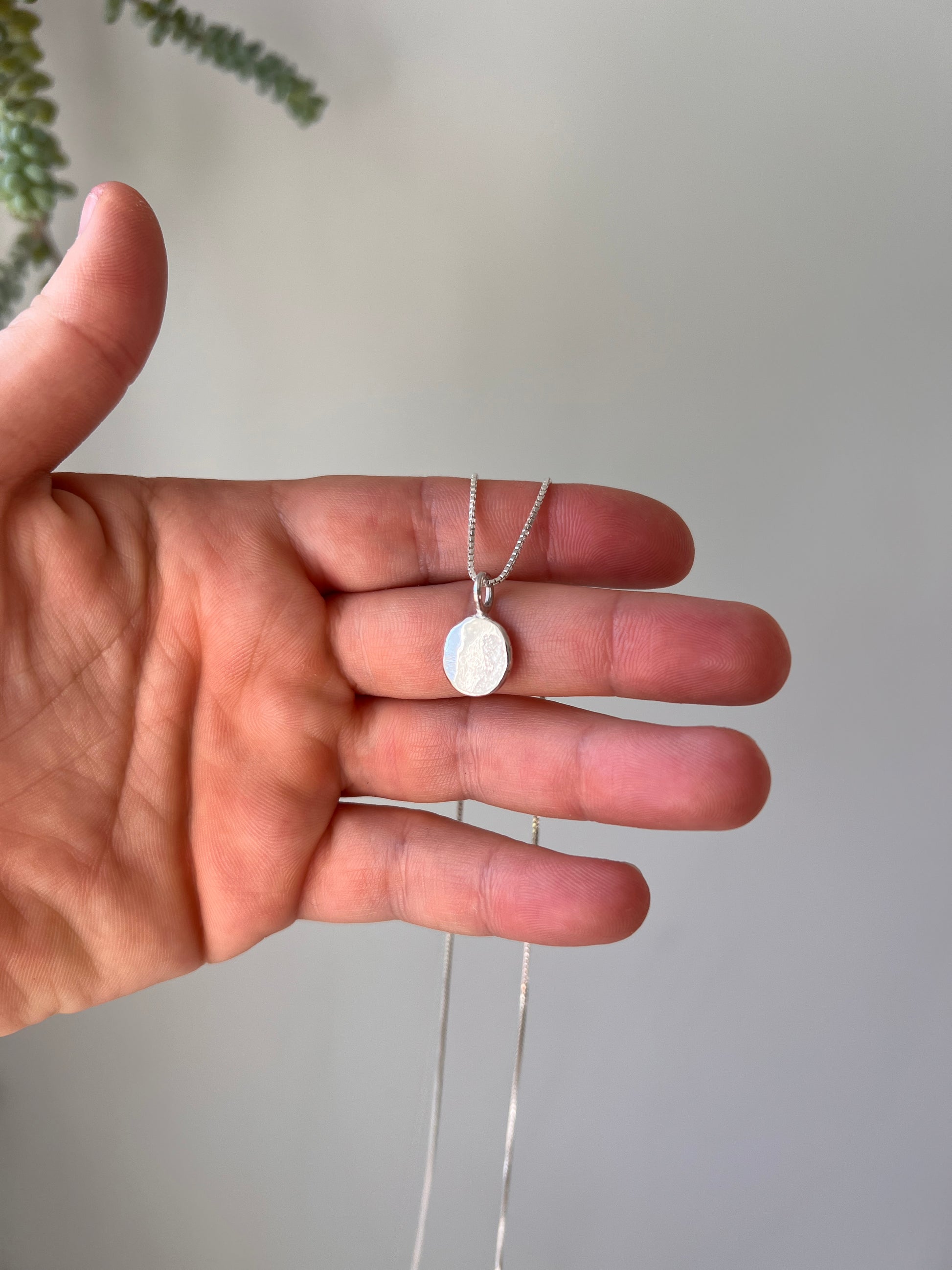 This is the large size of my classic dot necklace. Sterling silver chain box or ball chain. I hand make each charm in my studio melting down sterling silver and hammering it out to form the charm, making each piece unique and not the exact same as the next.