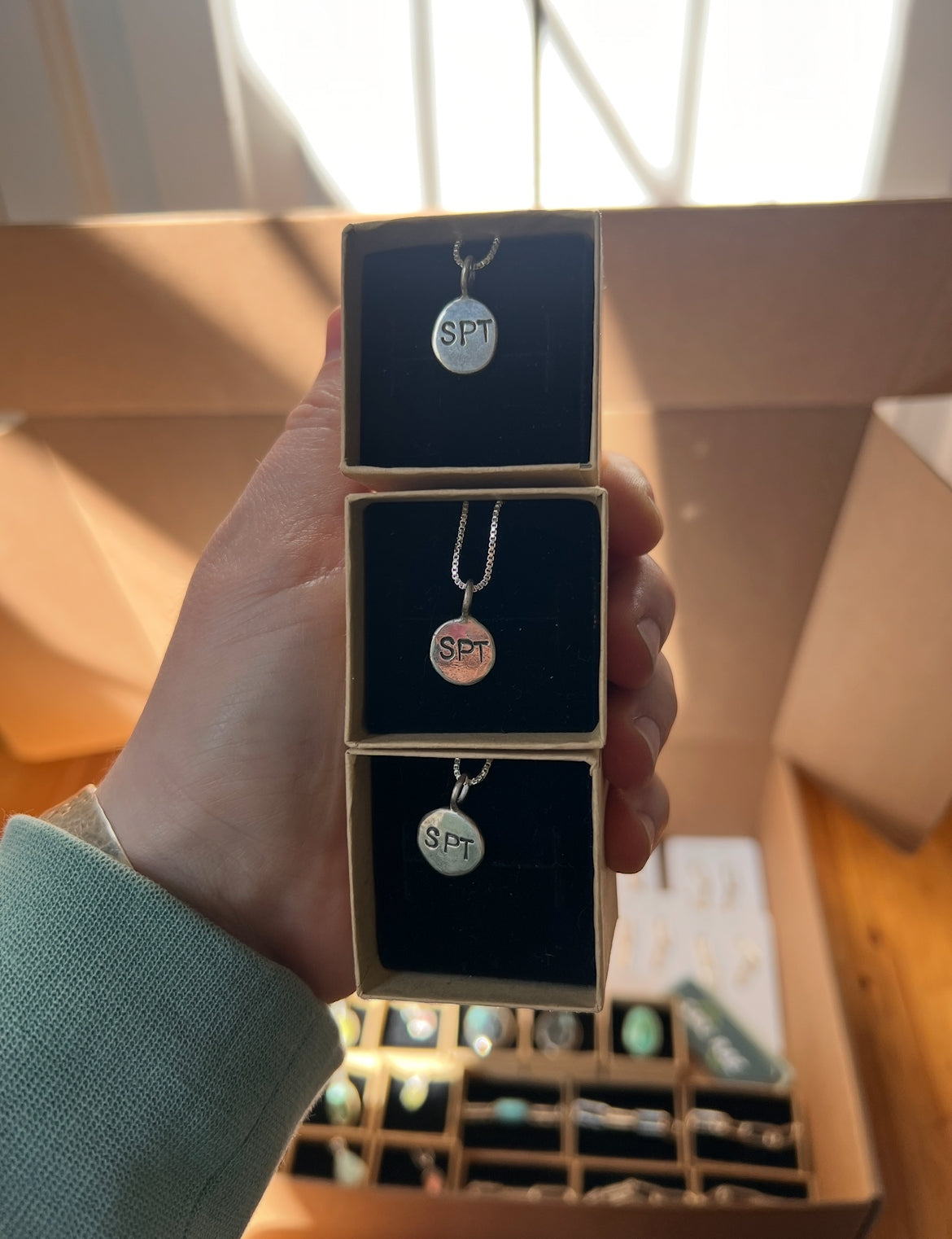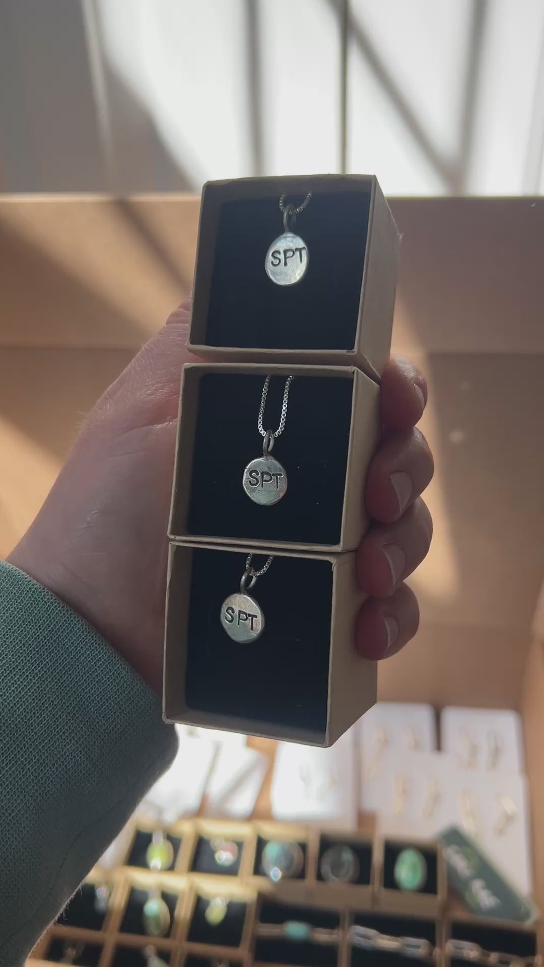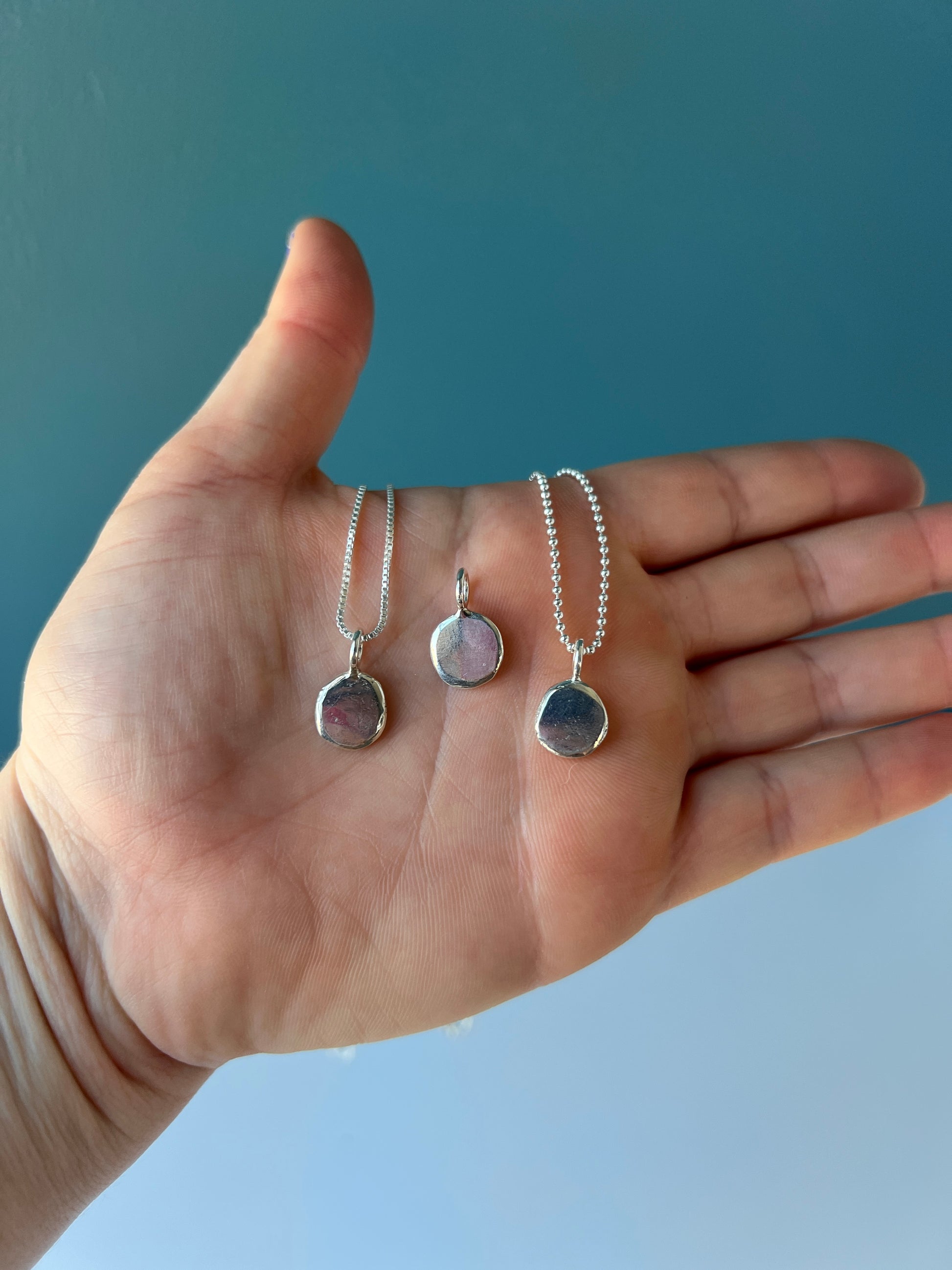This is the large size of my classic dot necklace. Sterling silver chain box or ball chain. I hand make each charm in my studio melting down sterling silver and hammering it out to form the charm, making each piece unique and not the exact same as the next.