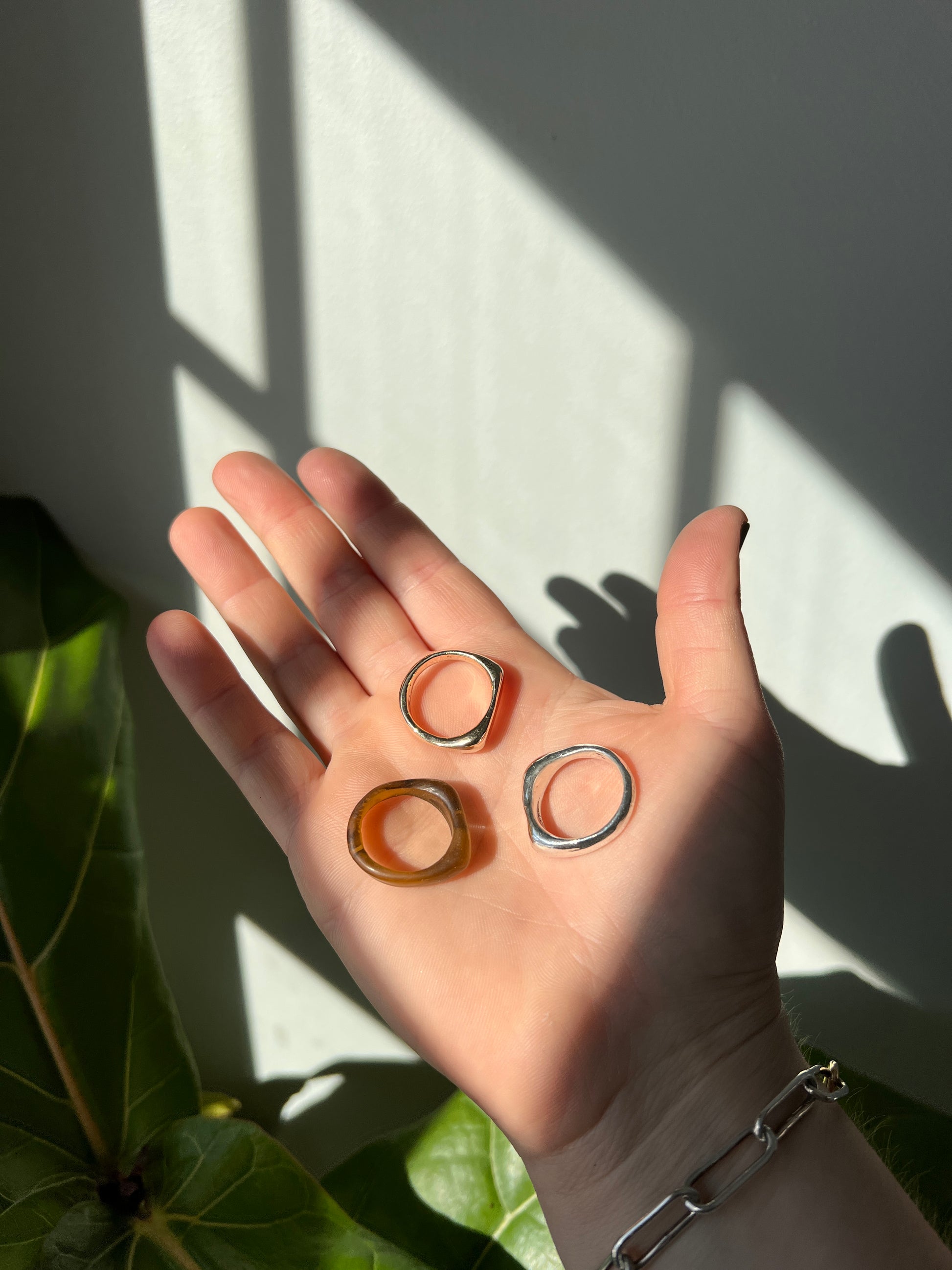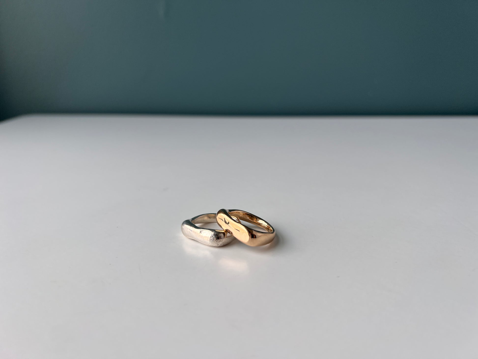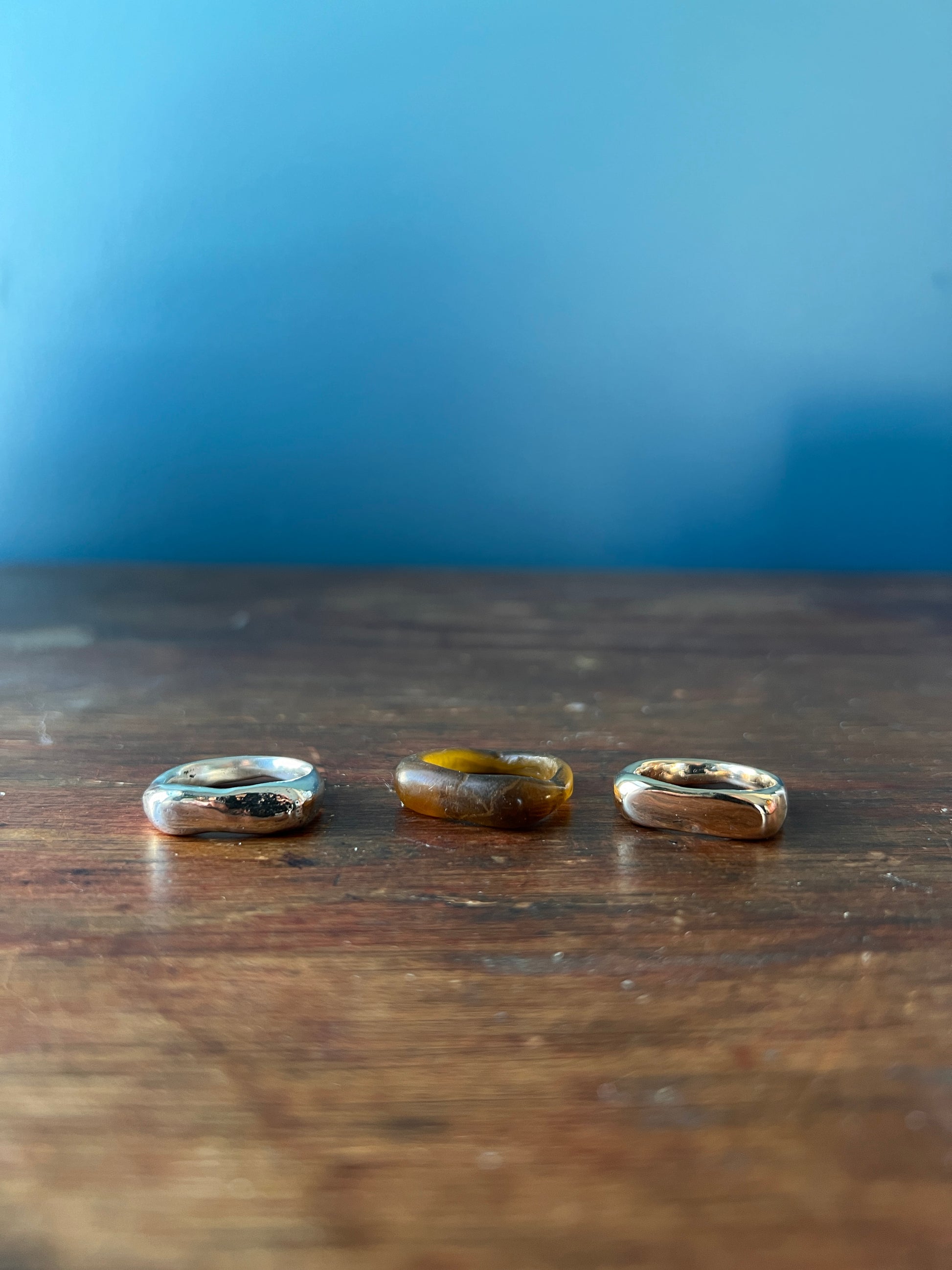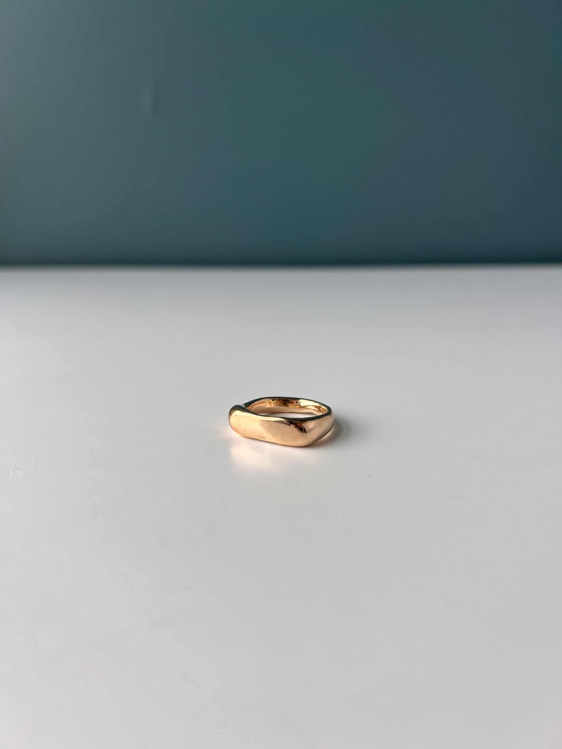 Hand carved in wax then sand casted in house in either recycled 14k yellow gold or recycled sterling silver, this ring will be your favorite everyday heirloom. The smooth edges lead you into the fluid curves, each ring different from the next, like each wave in the ocean.