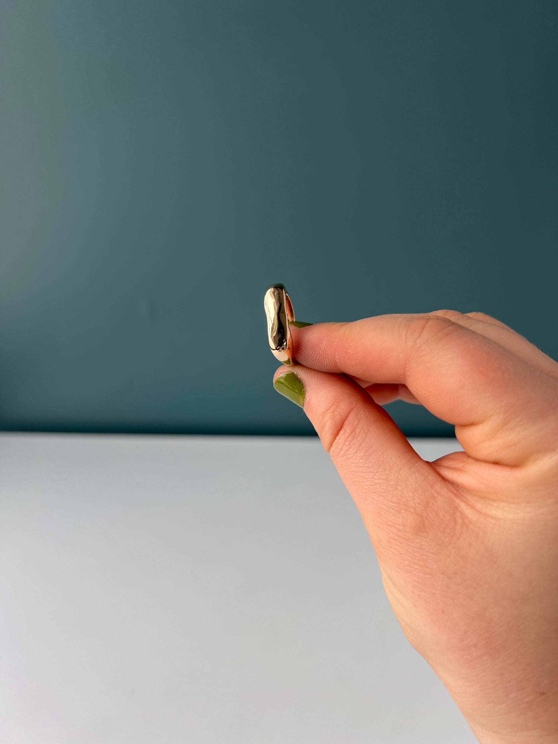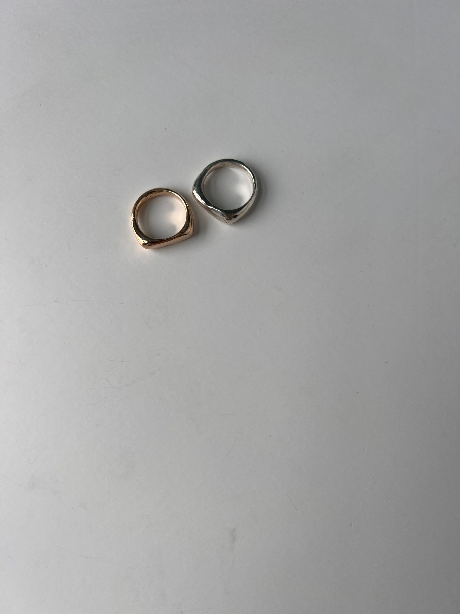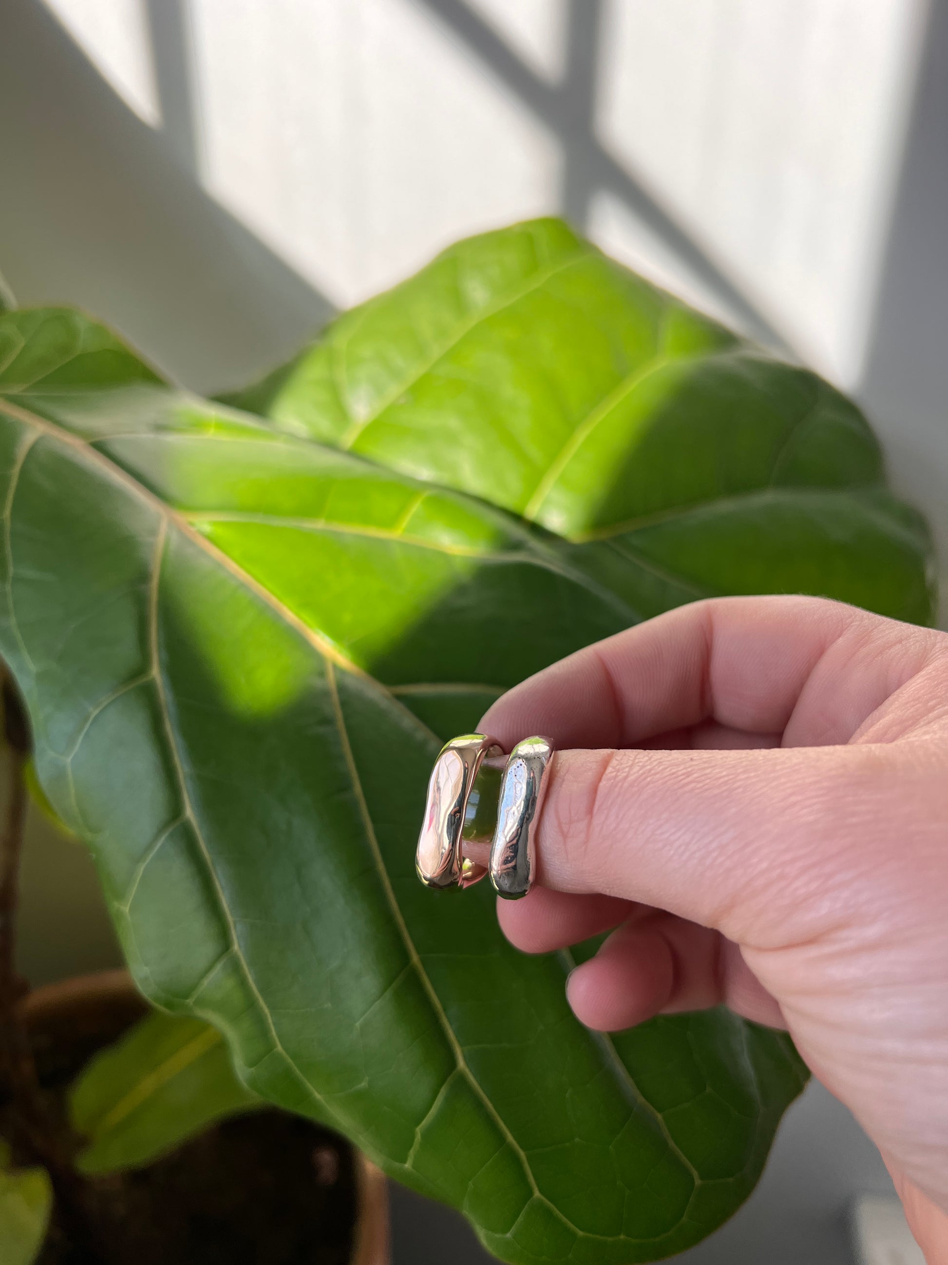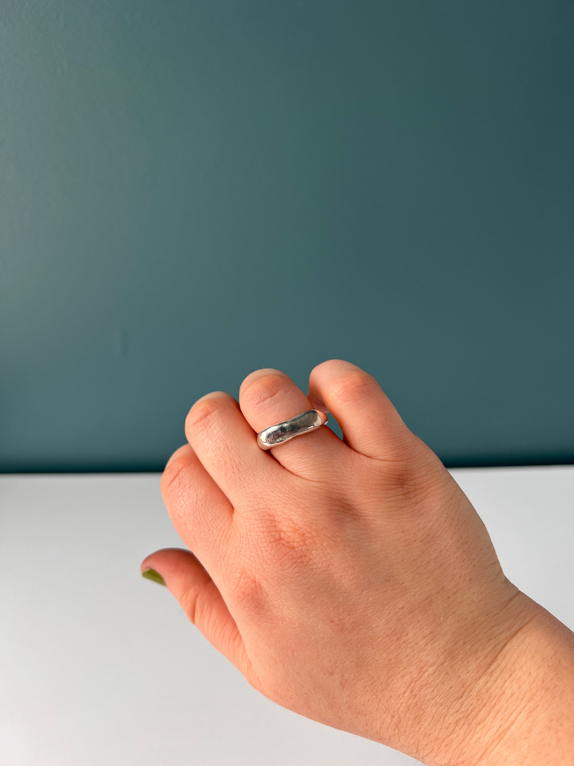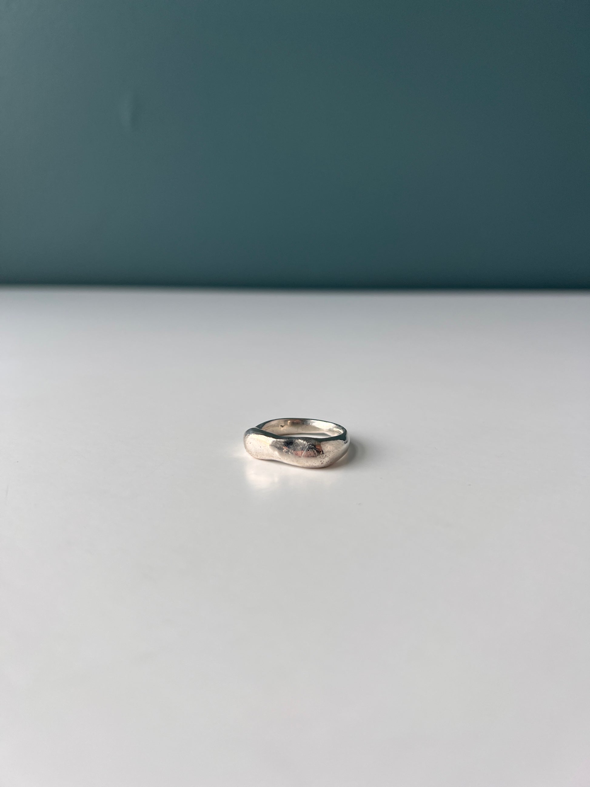 Hand carved in wax then sand casted in house in either recycled 14k yellow gold or recycled sterling silver, this ring will be your favorite everyday heirloom. The smooth edges lead you into the fluid curves, each ring different from the next, like each wave in the ocean.