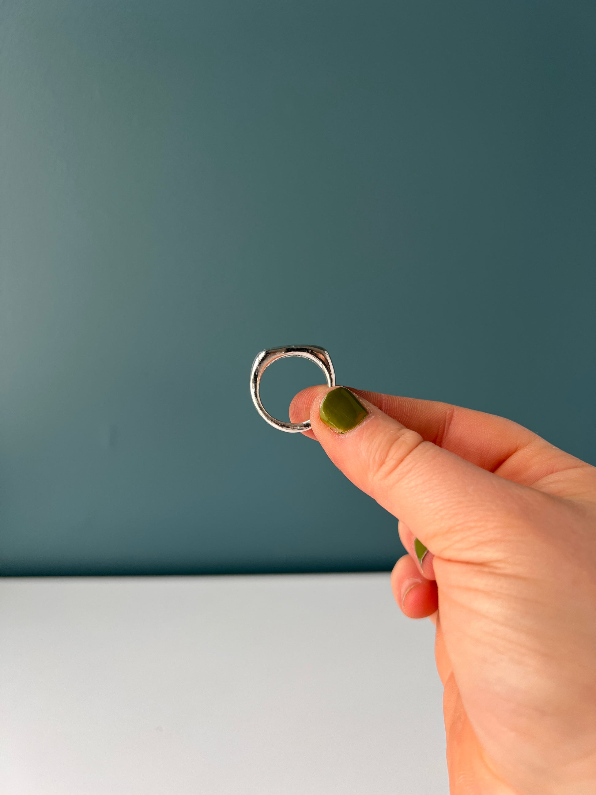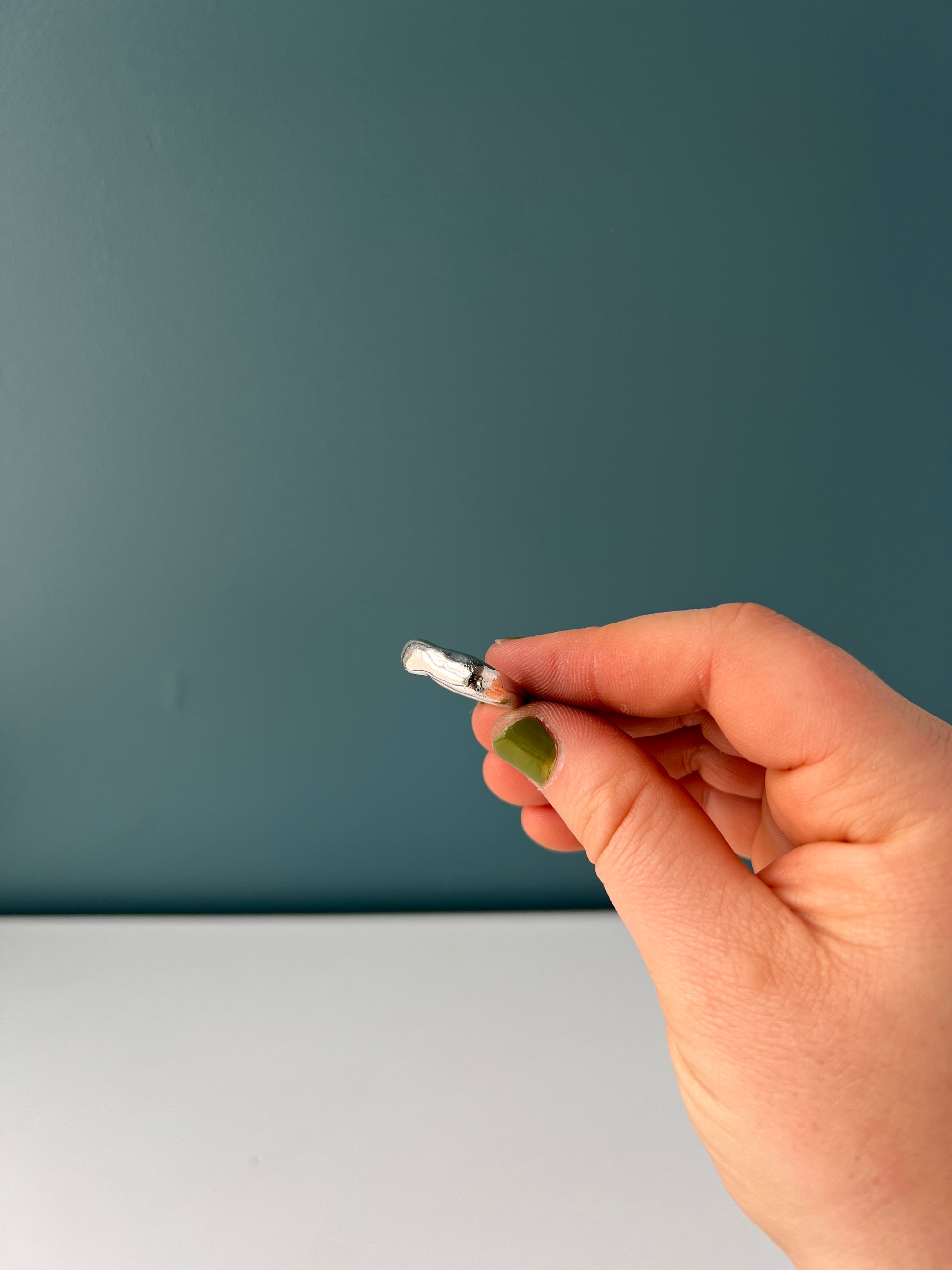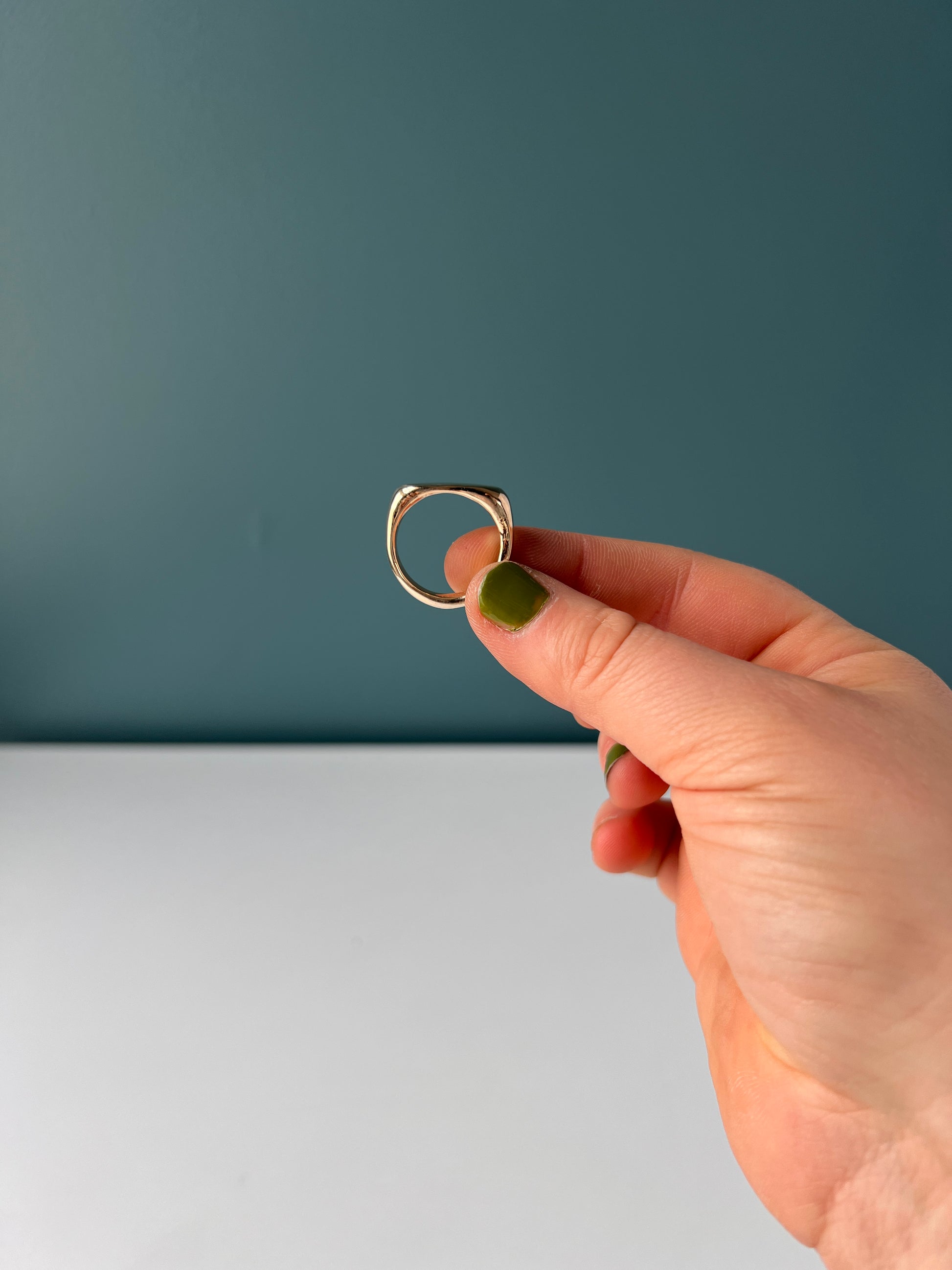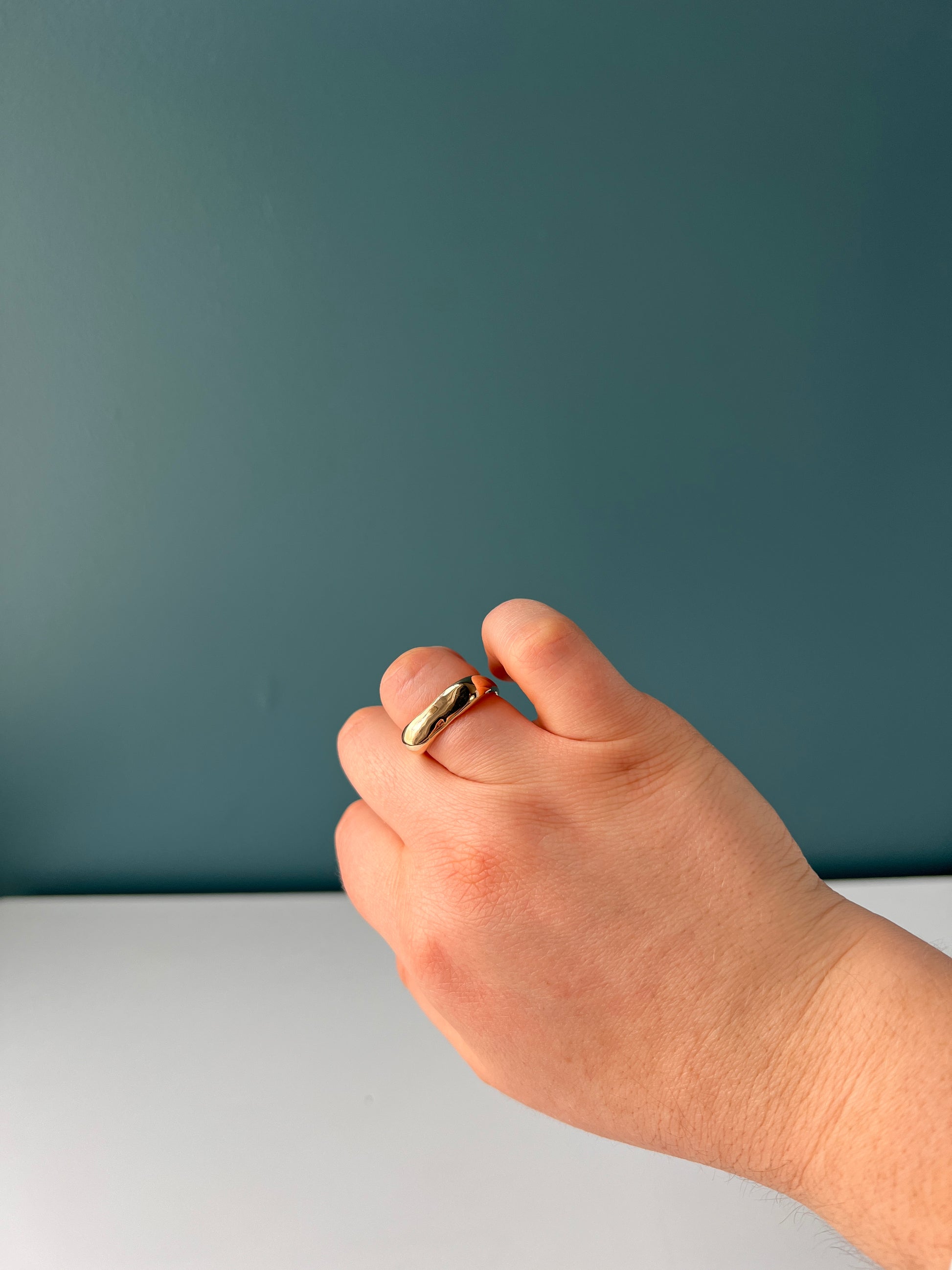 Hand carved in wax then sand casted in house in either recycled 14k yellow gold or recycled sterling silver, this ring will be your favorite everyday heirloom. The smooth edges lead you into the fluid curves, each ring different from the next, like each wave in the ocean.