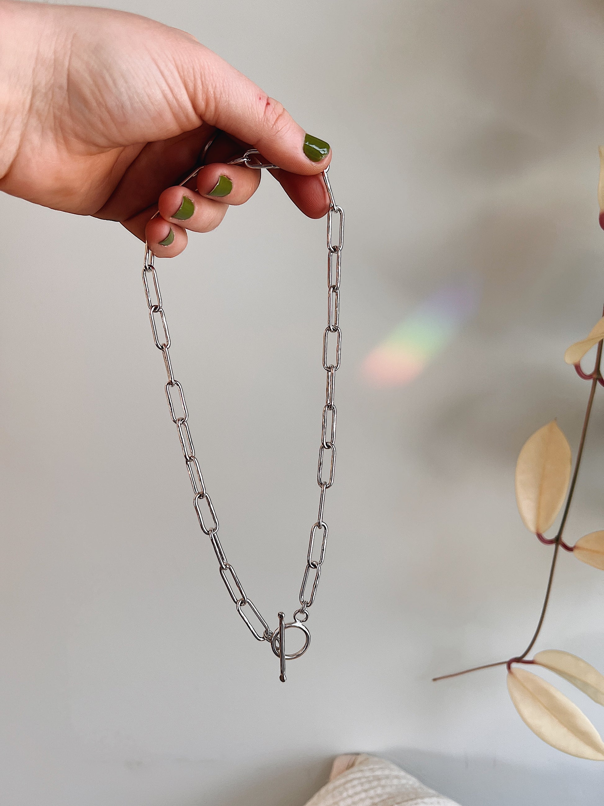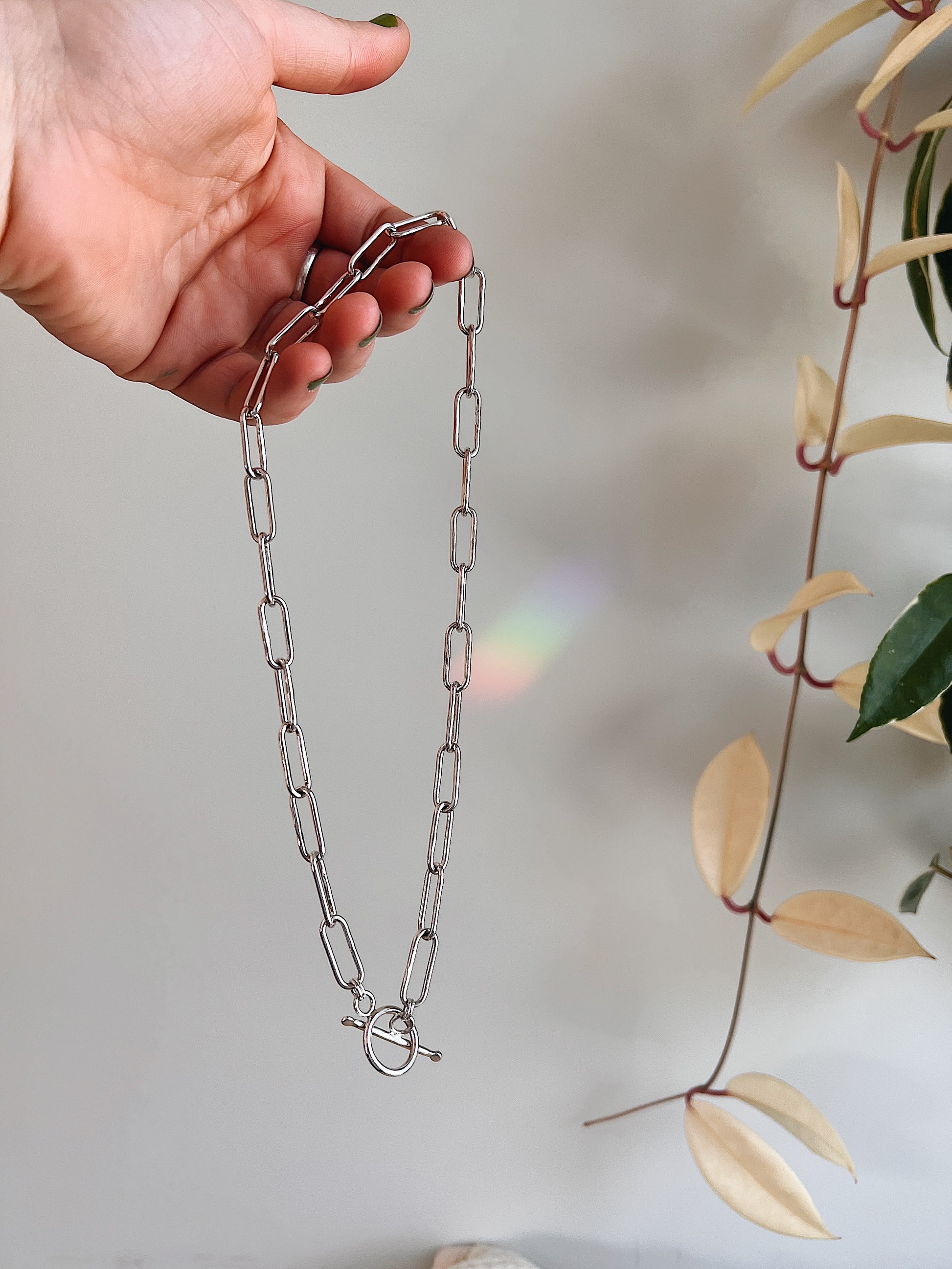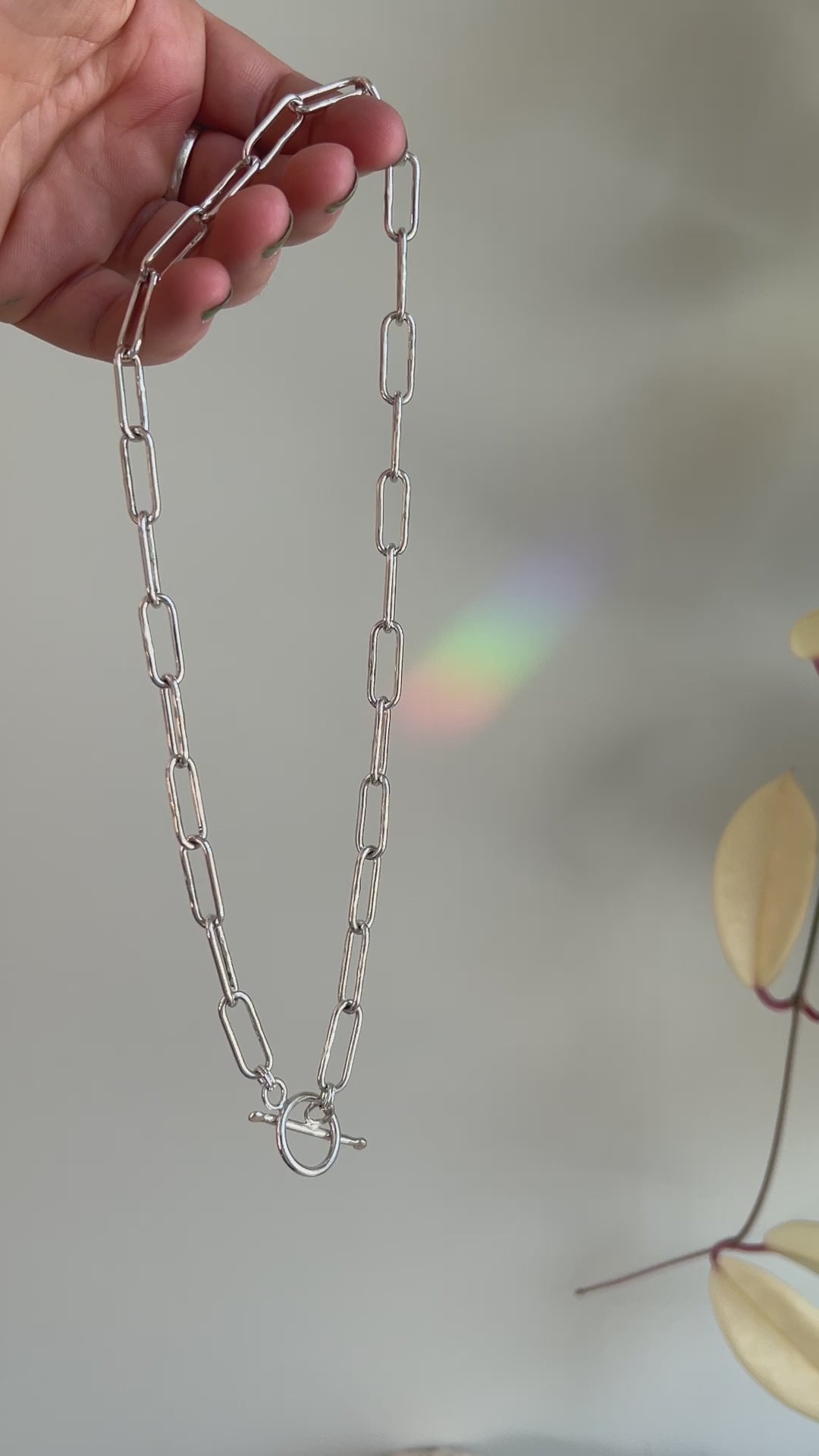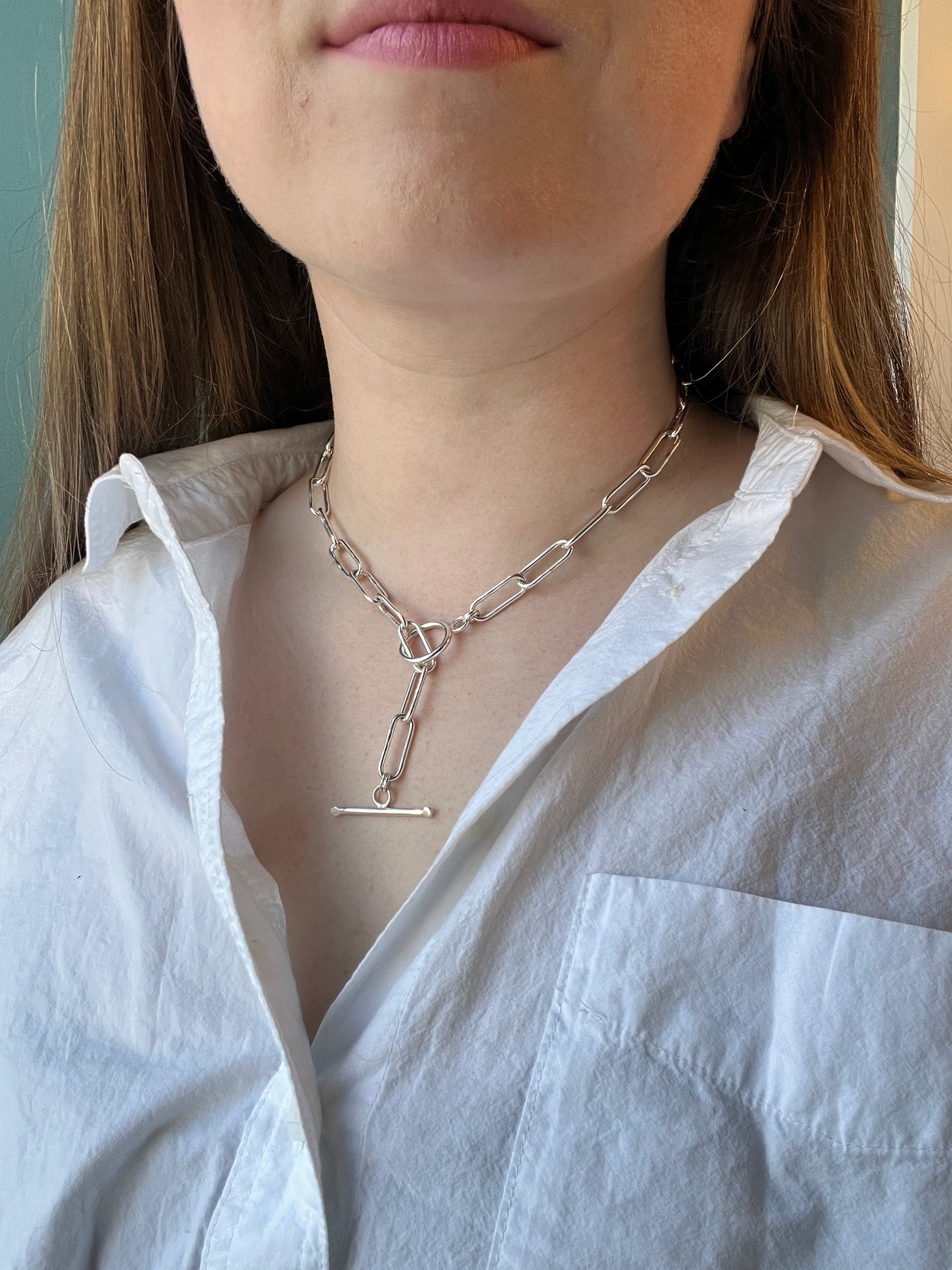 This is an all handmade piece, from the links to the toggle, I handcrafted every last detail. Sterling silver 18" long. You can wear this in a few different ways. With the toggle in the front or back or you can pull the bar slightly to tighten the necklace.