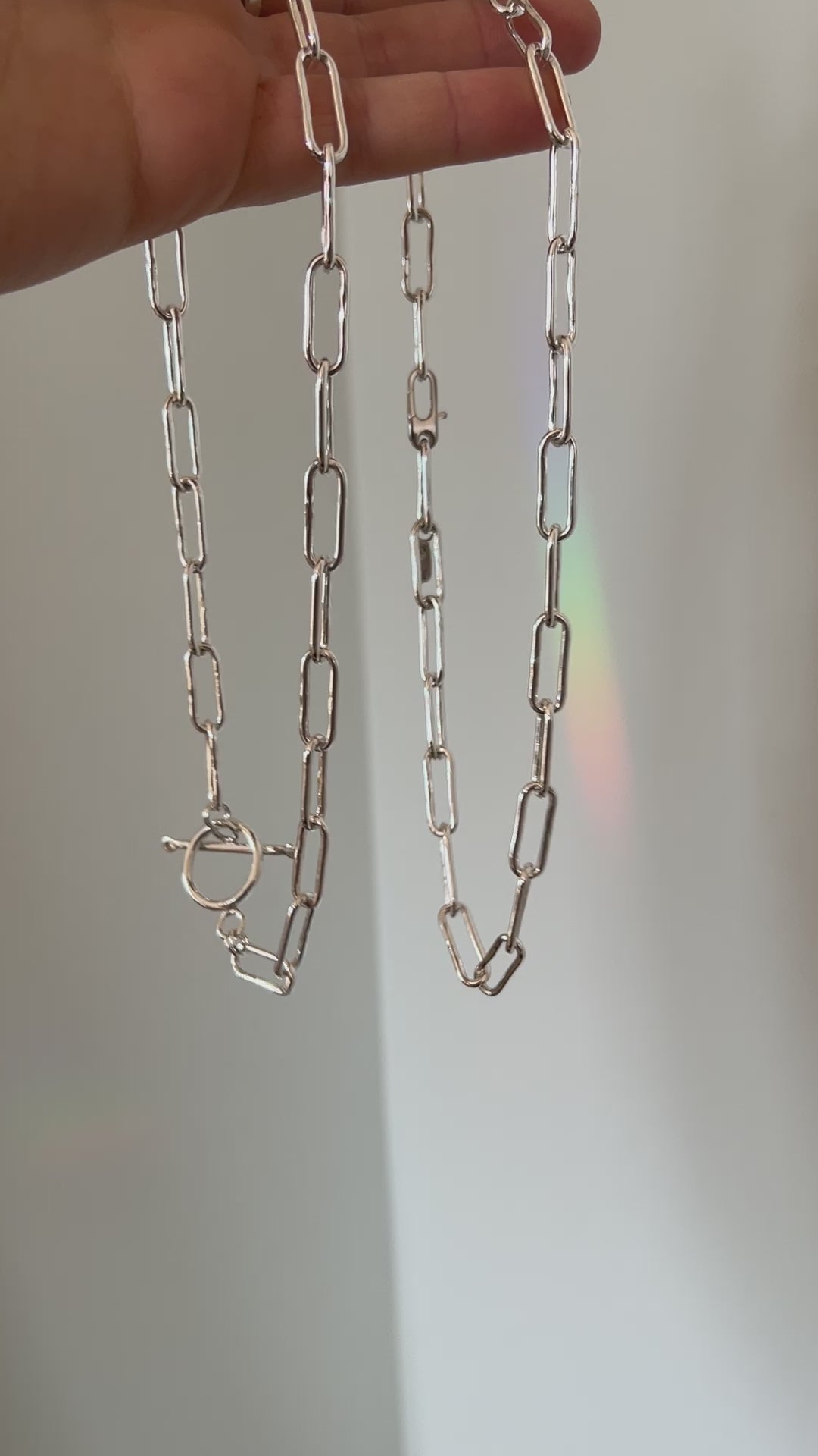 This is the same an all handmade paper clip chain you know and love, now with the option of a clasp instead of a handmade toggle. Sterling silver 18" long. You can wear this in a few different ways by clasping the necklace at any link to tighten the necklace.