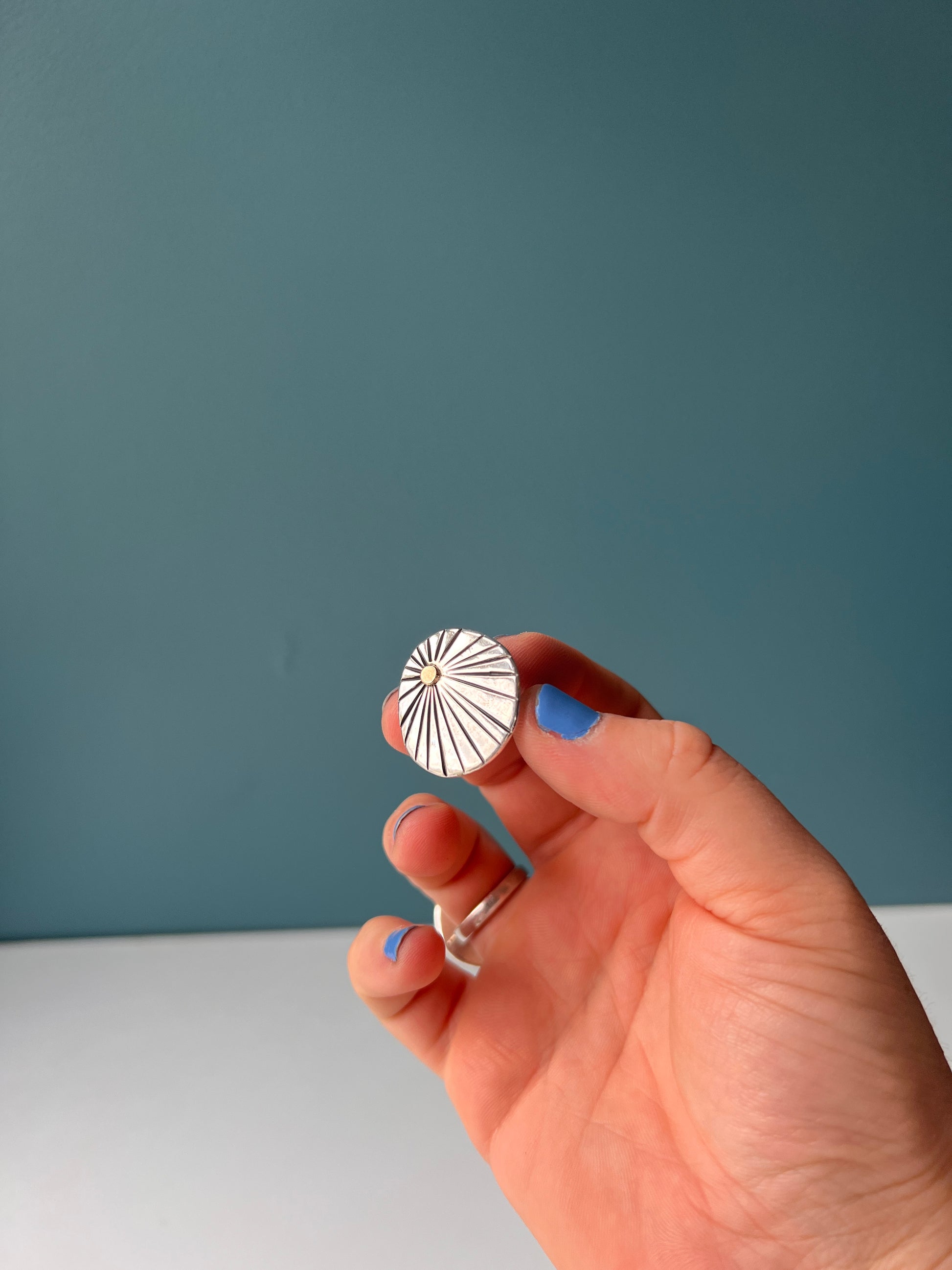 All of Sari Rae’s handmade jewelry uses recycled sterling silver and 14k yellow gold. These hammered disks are actually double recycled. They are the bits, bobs, bezels, and pieces of wire that are not used in a main design. I melt them down into a ball and hammer them out to the desired size/flatness!