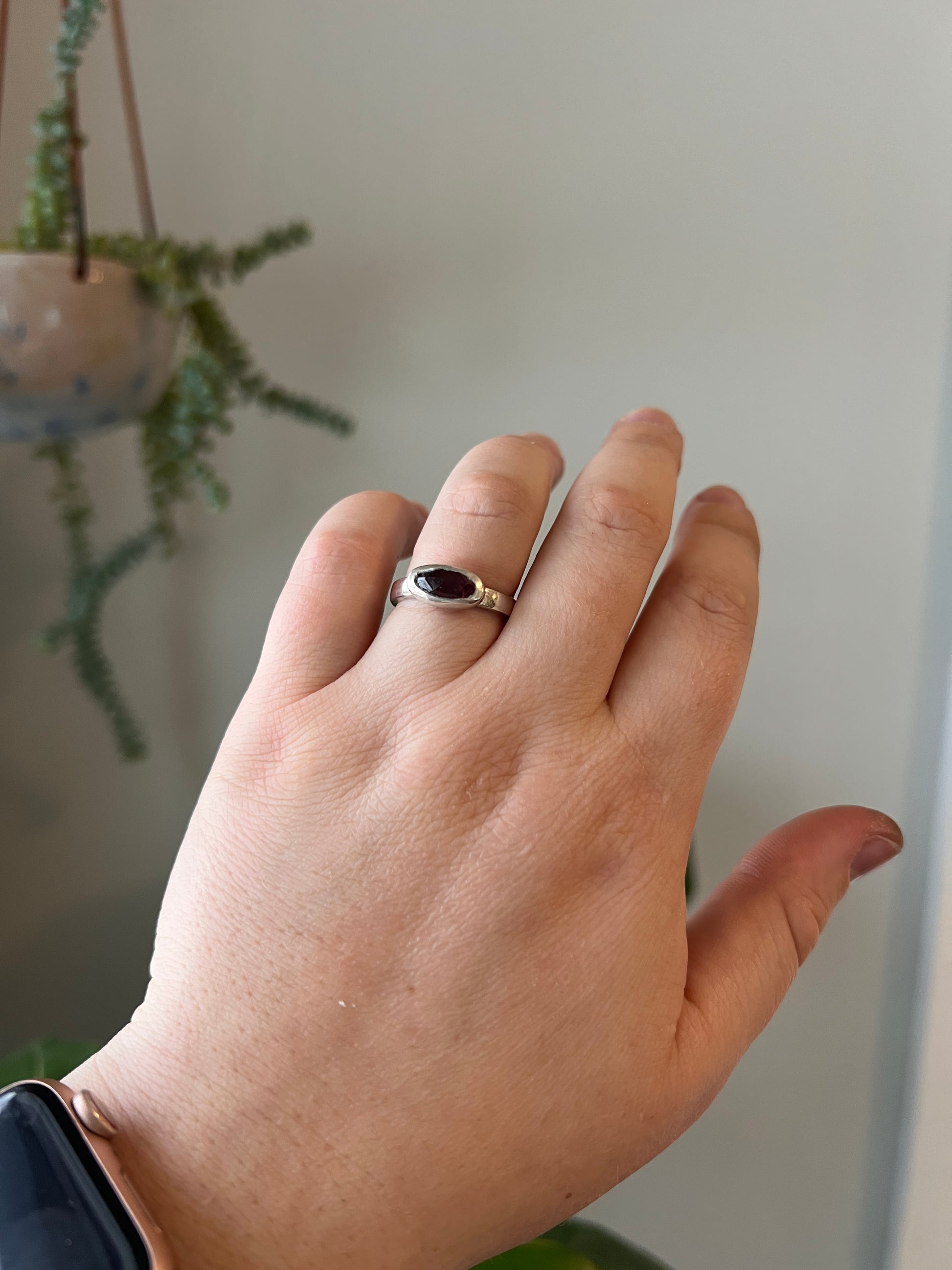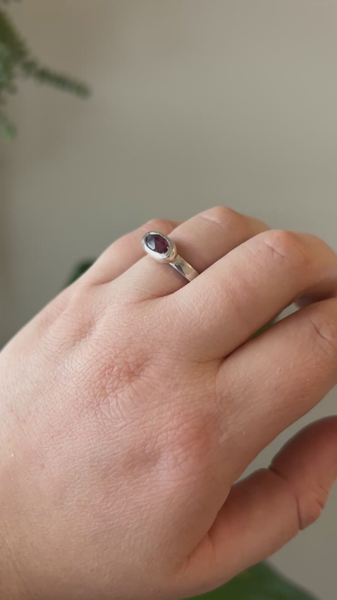 Deep pink color rose cut tourmaline set in sterling silver. Smooth band at a size 7 currently but can be sized up slightly!