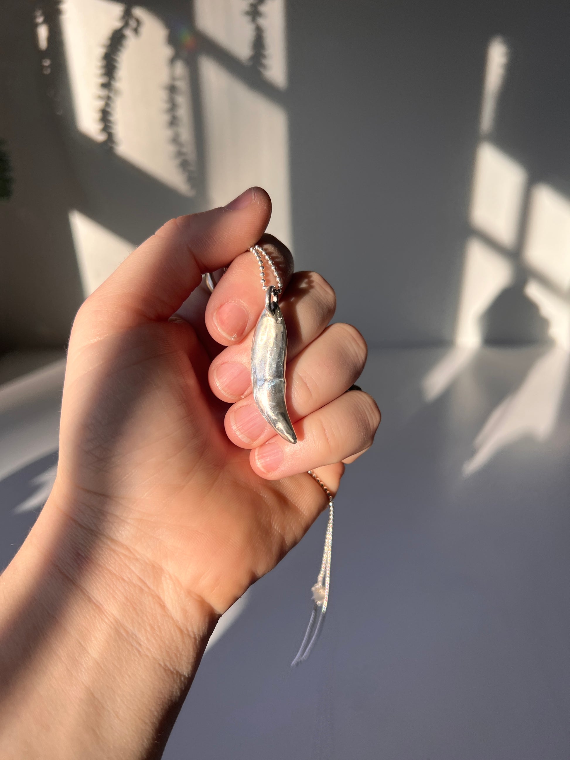 Solid sterling silver dog canine. With sterling silver chain. This is an exact mold of my dog Larson's canine tooth that needed to be removed just before his first birthday. I hand sand casted it in my studio here in Falmouth.