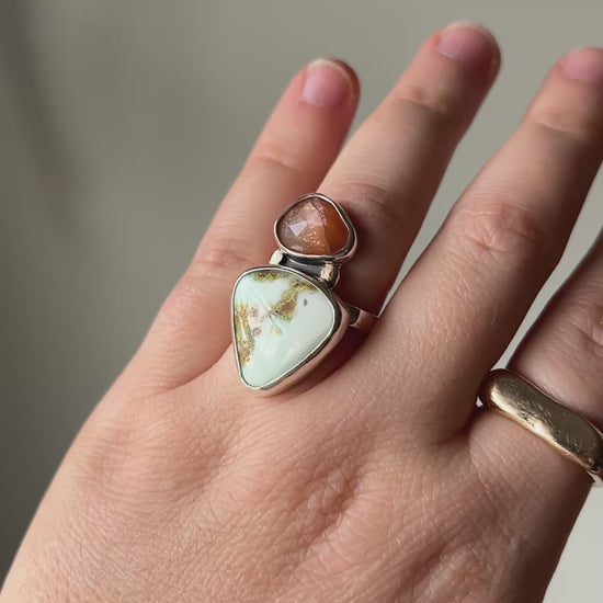 Gorgeous Palomino variscite stone from Nevada paired with a rose cut moonstone that has adularescence. Set in sterling silver. 14k yellow gold accents. Size 7. Smooth comfort fit band. Can be sized up slightly.